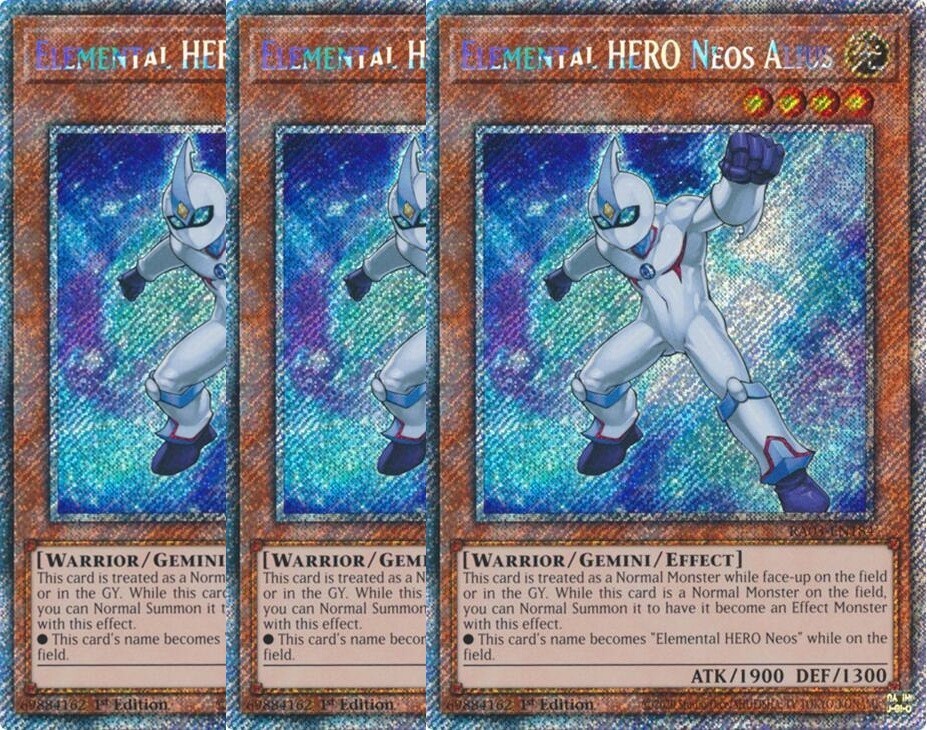 Dive into your next duel with the Elemental HERO Neo Alius playset from the Yu-Gi-Oh! TCG. This set includes three cards of the Platinum Secret Rare Effect type, ensuring that you'll have the upper hand in battle with their unique abilities. The cards are in English and part of the exclusive Quarter Century Bonanza set, a must-have for collectors and players alike. Each card showcases the iconic Elemental HERO Neo Alius, ready to merge with other cards to create powerful new strategies. Elevate your game and adapt to new challenges with this versatile playset, a valuable addition to any Yu-Gi-Oh! TCG arsenal.