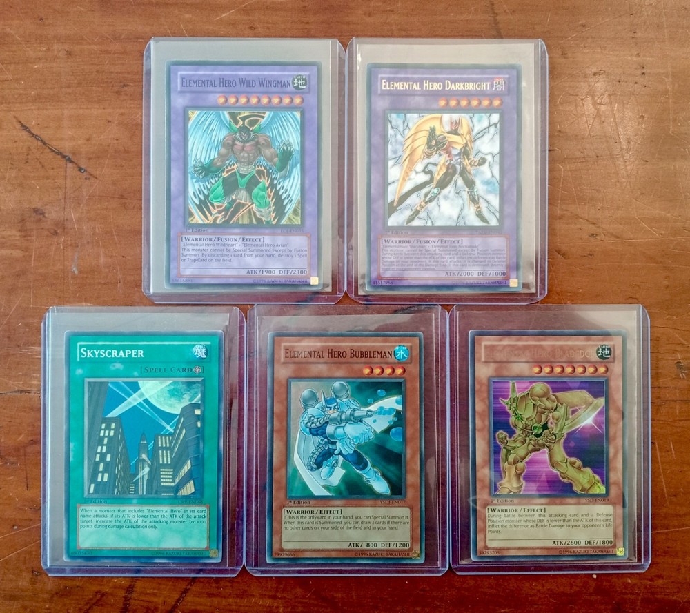 Yu-Gi-Oh 5 X Elemental Hero Cards MP-Mint Condition 1st Edition TAEV USD EOJ CRV - Bladedge 1st Edition YSD-EN019 Ultra Rare NM condition - Wild Wingman 1st Edition EOJ-EN035 Super Rare NM-Mint Condition - Darkbright 1st Edition TAEV-EN042 Ultra Rare LP-MP Condition - Bubbleman 1st Edition YSDJ-EN017 Super Rare NM - Skyscraper 1st Edition CRV-EN048 Super Rare MP If you have any questions please feel free to message me!