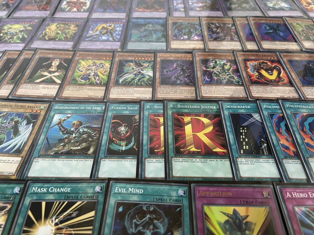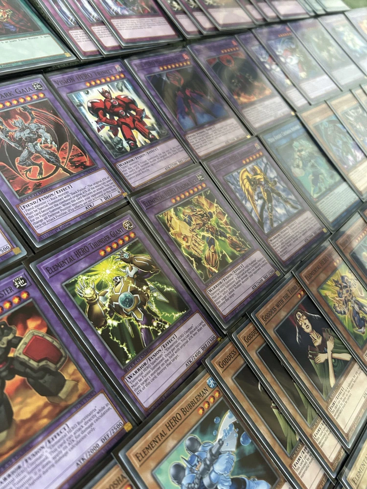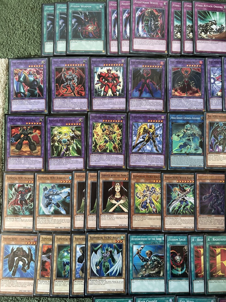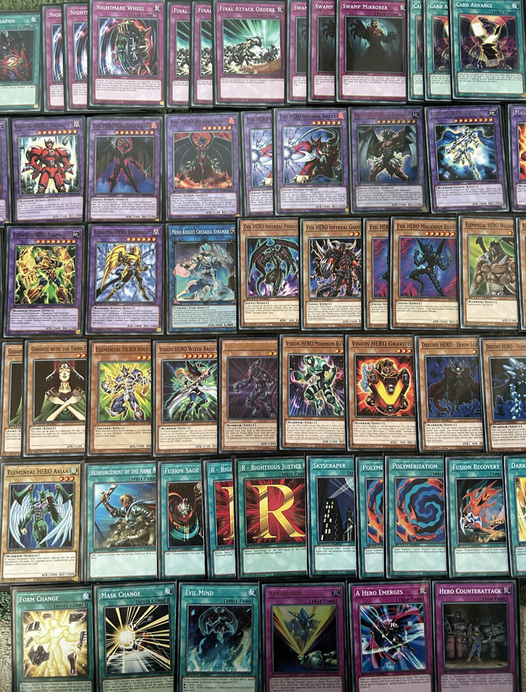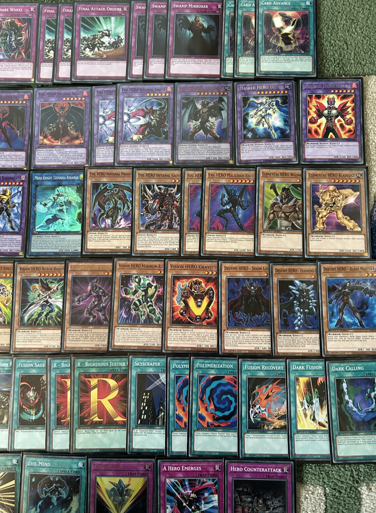 A complete, High Rarity, 70 Card Elemental HERO & Evil + Vision Deck core with a full 15 Card Extra & Side Deck. The deck is entirely and uniformly sleeved in Konami Brand sleeves so you're ready to go as soon as they arrive. The general condition of the deck is Mint N/M condition and cards are delivered as pictured, every card listed here will be delivered to you. This deck will be sent Signed For and will be properly protected. Please check out my other listings and don't hesitate to contact me with any inquiries. Always willing to take further photographs of specific cards when requested and will work with you to create multiple listing discounts etc.