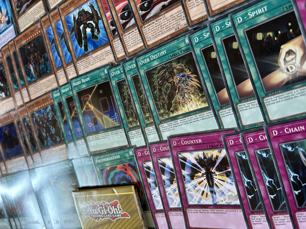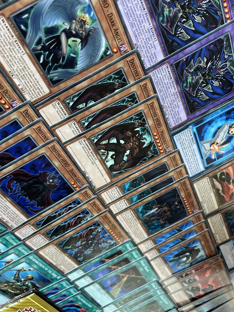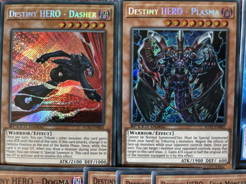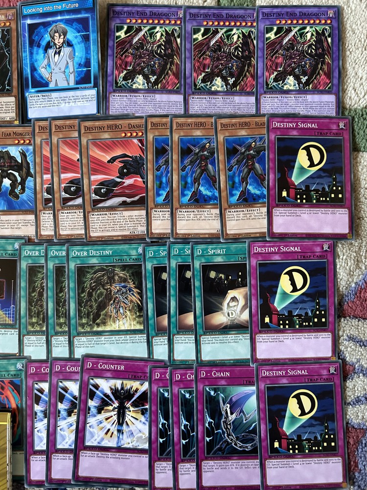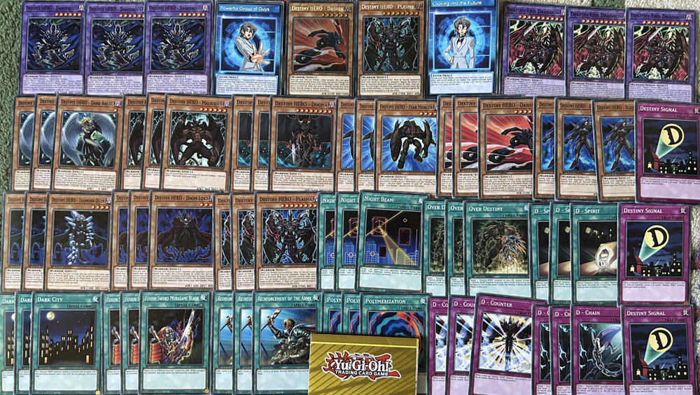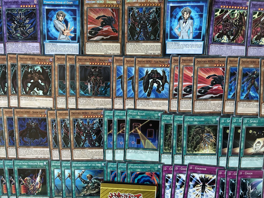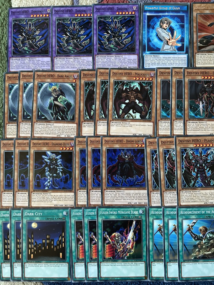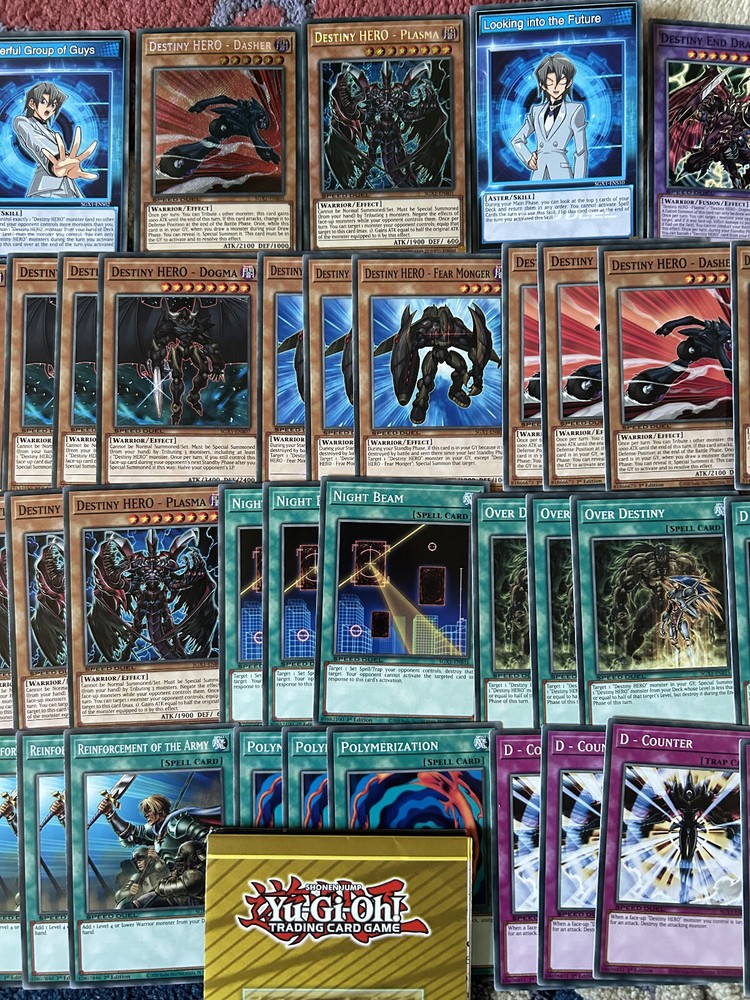A Yu-Gi-Oh! TCG & SPEED DUEL Aster Destiny Hero Fusion Deck & Secret Rare Collection , in Mint N/M condition. A Perfect, low cost introduction (or reintroduction!) to the game for any fans of the classic Yu-Gi-Oh Series with a ready to play deck for a local tournament, friendly duels, or SPEED DUELS. You will be delivered a free paper game mat, 2 Aster Phoenix (Destiny Hero) Skill Cards and every card pictured Destiny End Dragoon x3 Destiny HERO - Dangerous x3 Destiny HERO - Plasma x3 Destiny HERO - Doom Lord x3 Destiny HERO - Diamond Dude x3 Destiny HERO - Blade Master x3 Destiny HERO - Dasher x3 Destiny HERO - Fear Monger x3 Destiny HERO - Dogma x3 Destiny HERO - Malicious x3 Destiny HERO - Dark Angel x3 Polymerization x3 Reinforcement of the Army x3 Dark City x3 D - Spirit x3 Over Destiny x3 Destiny Signal x3 D - Chain x3 D - Counter x3 Night Beam x3 This collection will be sent via Royal Mail and will be properly protected. Please check out my other listings and don't hesitate to contact me with any inquiries. Always willing to take further photographs of specific card listings when requested and will work with you to create multiple listing discounts etc.