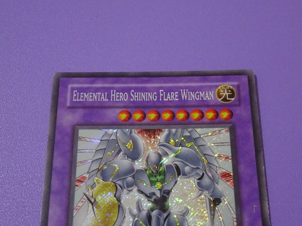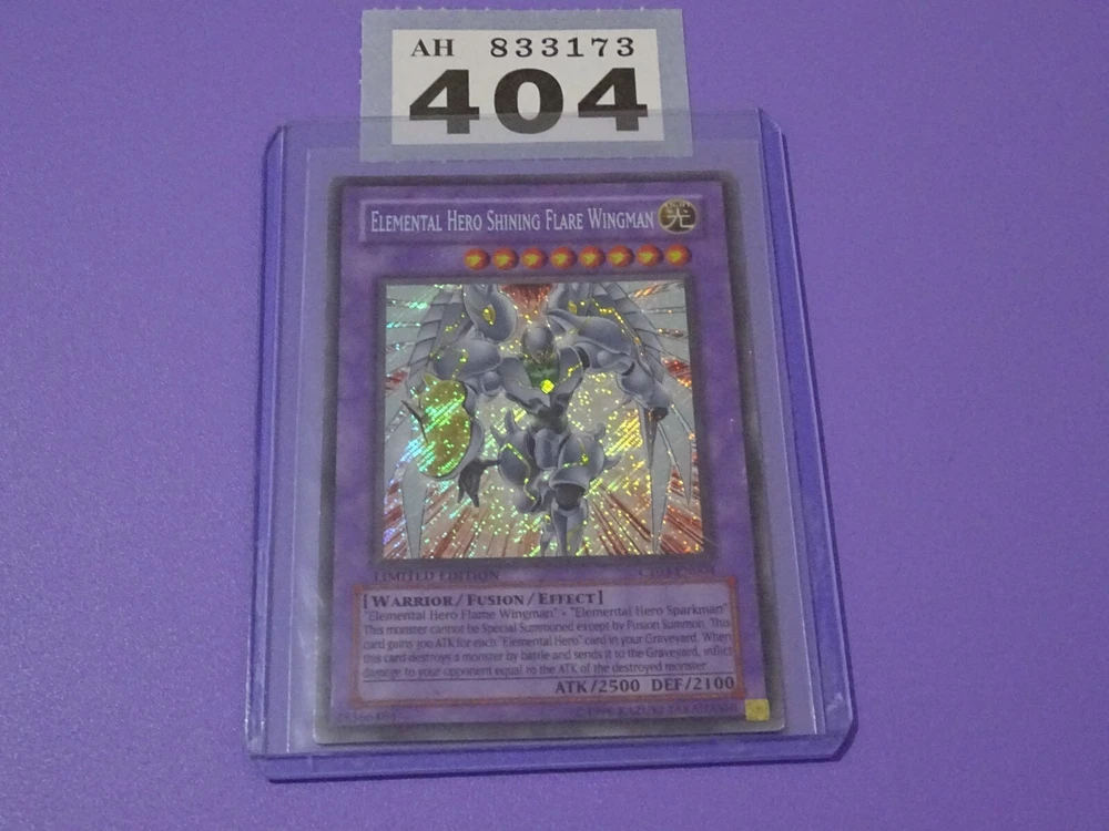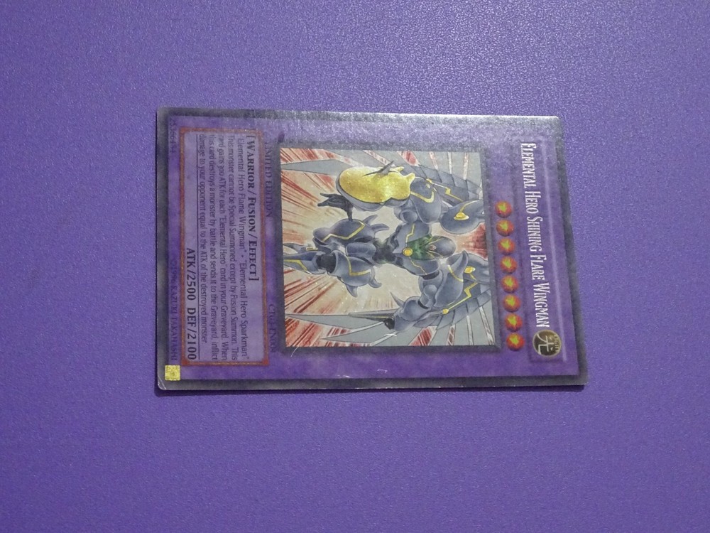 This card is a must-have for any Yu-Gi-Oh! collector! The Secret Limited Edition Shining Flare Wingman looks amazing, even with some minor wear—it adds character! Comes safely sleeved and in a top loader for protection. Photos show the condition clearly, and the seller offers great deals on multiple purchases. A fantastic addition to any Hero deck!