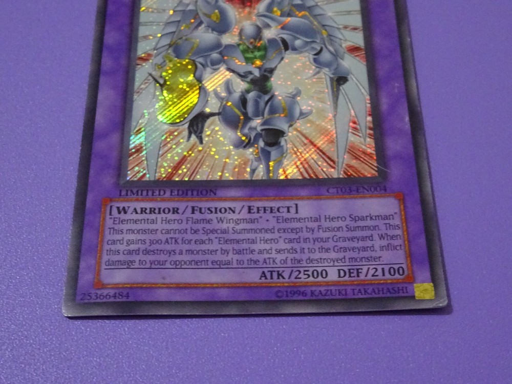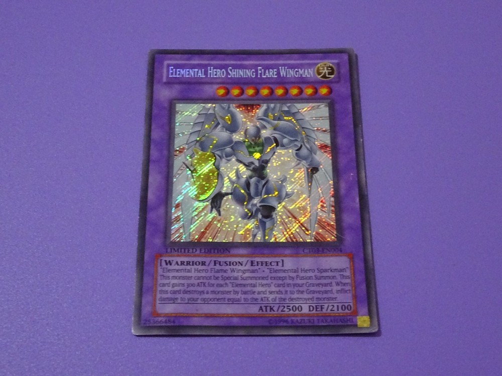 Hello and welcome to my auction. Yu-Gi-Oh! CT03-EN004 Elemental Hero Shining Flare Wingman Secret Limited Edition card. The card is in moderate condition with some wear and play. This card comes in a sleeve and protective Top Loader / case. Please check out the photos for detail of condition and any imperfections. Please check out my other YuGiOh! Cards and Collectable items as more are added regularly. All item/s are sold as seen, What you see is what you get I offer postage discounts on multiple wins If you have any questions please feel free to contact me and i will respond within 24 hours Payment within 3 days of auction ending please Items will usually be dispatched within 3 working days after receiving cleared payment. Many thanks and good luck