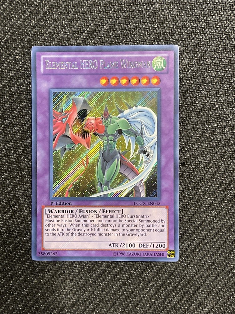This Yu-Gi-Oh! TCG card is a must-have for any collector or player. The Elemental HERO Flame Wingman is a Fusion card with a Wind attribute, and is part of the Legendary Collection 2 set. This card features a foil finish and is a 1st Edition Secret Rare collectible. The card is standard size and in English language, suitable for ages 6 and up. It is not autographed and has the card number 35809262. This card is perfect for anyone looking to add a rare and powerful card to their collection or deck.