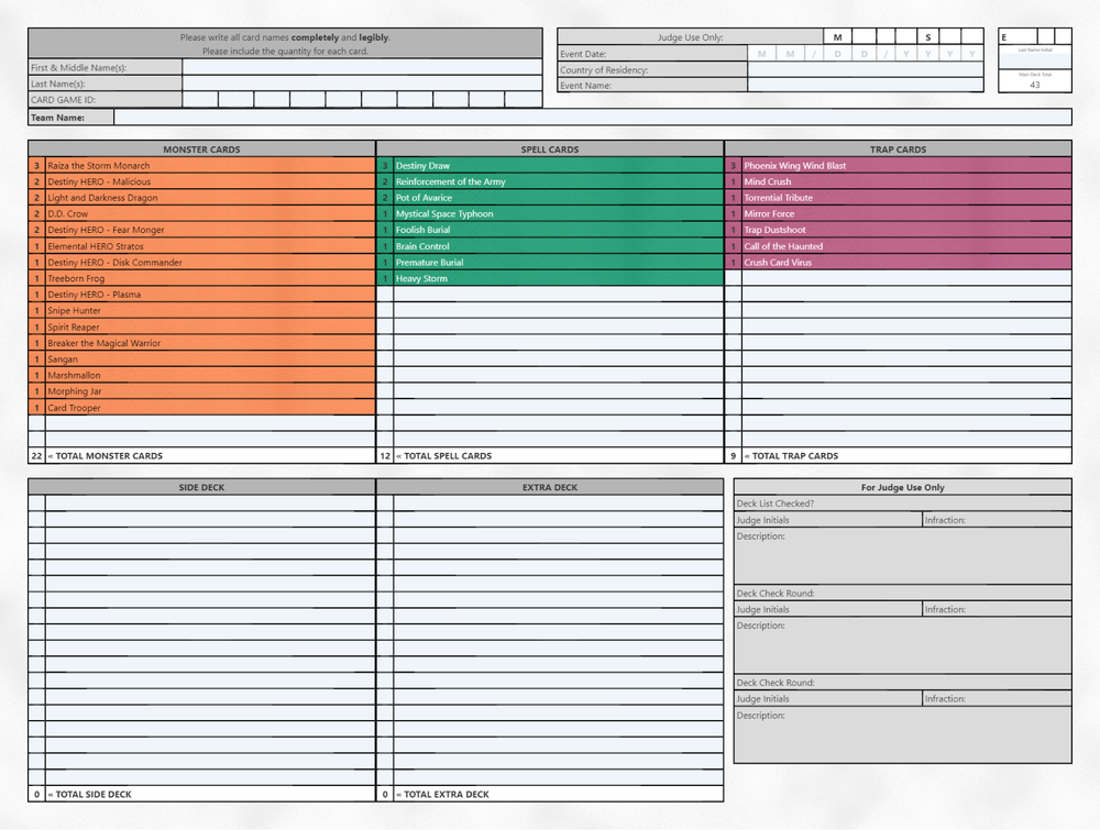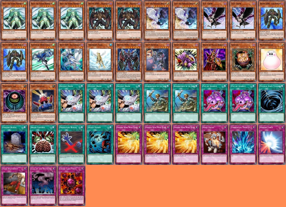 You are buying: MONSTER CARDS 3 Raiza the Storm Monarch 2 Destiny HERO - Malicious 2 Light and Darkness Dragon 2 D.D. Crow 2 Destiny HERO - Fear Monger 1 Elemental HERO Stratos 1 Destiny HERO - Disk Commander 1 Treeborn Frog 1 Destiny HERO - Plasma 1 Snipe Hunter 1 Spirit Reaper 1 Breaker the Magical Warrior 1 Sangan 1 Marshmallon 1 Morphing Jar 1 Card Trooper 22 « TOTAL MONSTER CARDS SPELL CARDS 3 Destiny Draw 2 Reinforcement of the Army 2 Pot of Avarice 1 Mystical Space Typhoon 1 Foolish Burial 1 Brain Control 1 Premature Burial 1 Heavy Storm 12 « TOTAL SPELL CARDS TRAP CARDS 3 Phoenix Wing Wind Blast 1 Mind Crush 1 Torrential Tribute 1 Mirror Force 1 Trap Dustshoot 1 Call of the Haunted 1 Crush Card Virus 9 « TOTAL TRAP CARDS Condition: Near Mint to Light Play | Language: English All photos are stock unless mentioned otherwise. Store Policies If you have any questions or can't seem to find something that you want please do not hesitate to contact us. We do not list our entire inventory on eBay. We will respond to all questions within one business day. Info: Items will be shipped within 1 business day upon receiving cleared payment. We ship Monday through Friday in order to get the item(s) to you as quickly as possible Before leaving neutral or negative feedback, please contact us beforehand so we can discuss the issue. Feel free to message me with any questions you have regarding this auction or my policies. Grading Scale: This is the scale we use when listing cards. Please read carefully and check the listing title's condition so you know what to expect: Near Mint (NM)- Cards with this grade will contain no more than two micro blemishes. (A micro blemish is a small almost invisible scratch or ding). NM cards do not have visible signs of play which means no whitening, no fading, no edge wear, no corner or side dings, no creases, no tears, no rips, no small pieces missing, and no inking of the face or borders of the card. Lightly Played (LP)- Cards with this grade will contain more than two micro blemishes. They may have a dinged corner, mild edge wear or whitening, and they may contain some fading. LP cards do not contain the following types of damage: no creases, no tears, no rips, no small pieces missing, and no inking of the face of the card. Moderately Played (MP)- Cards with this grade will contain some form of the following: dinged corners, edge wear or whitening, fading, small creases or bends that do not extend across the entire card, and they may also be signed by someone. MP cards do not contain the following types of damage: no tears and no rips. Heavily Played (HP)- Cards with this grade will contain some if not multiple of the following: dinged bent or missing corners, heavy edge wear, extreme fading, large creases or bends that can extend across the entire card, and they may also be signed drawn on or coloured in. HP cards do not contain the following types of damage: no tears and no rips. Damaged- Cards with this grade have it for a reason. Not for high-level events unless they are extra deck cards. Cards with this grade have destroyed or missing corners, heavy edge wear, extreme fading, multiple large creases or bends that can extend across the entire card. They can be signed, drawn on, coloured in, ripped, torn, severely water damaged, and missing pieces. Shipping Information: We ship Monday through Friday, barring national holidays during which the United States Postal Service is closed. The shipping and handling time is one business day once payment is cleared. For shipping in the United States: First Class Mail:FREE for all singles. Orders over $20 (exc. sales tax) receive free tracking. Priority Mail with Delivery Confirmation: $7.99: for 2-3 Day shipping USPS Priority Mail Express: $32.99 for 1-2 Day shipping For international orders: We will ship to almost any country. The buyer is responsible for any duty or customs tax. The cost of shipping is based on the shipping address and will be shipped with tracking and will be covered under PayPal's Seller/Buyer Protection program. Return Policy: You must return items sold and fulfilled by Phantasm Gaming within 14 days of delivery to be eligible for a refund. Returns which are damaged in the mail due to improper return packaging will not receive a refund. The buyer will pay for return shipping. We will process a full refund for all items returned in their original condition.