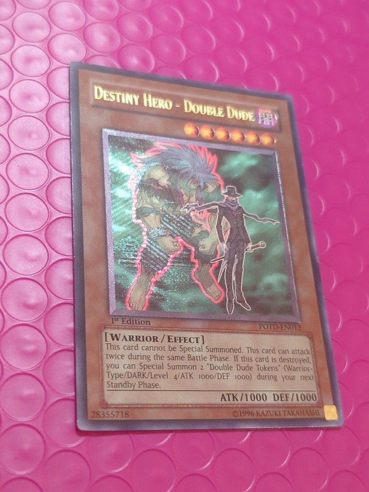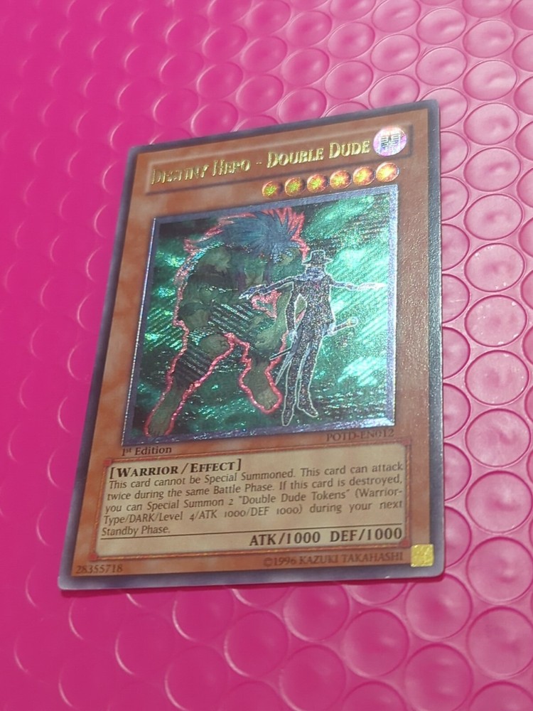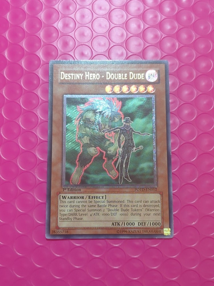 Yu-Gi-Oh! DESTINY HERO - DOUBLE DUDE POTD-EN012 1st Edition Ultimate NM. The condition of this card is: Near Mint *All cards sold will be inside of a penny sleeve and top load card holder. Packaging will be in a bubble envelope for extra protection.* **In an attempt to empty my collection, every order will come with a gift of additional sleeved cards of various conditions that may fit the theme/archetype (depending on what's remaining in my collection). The bigger the sale, the bigger the gift!**