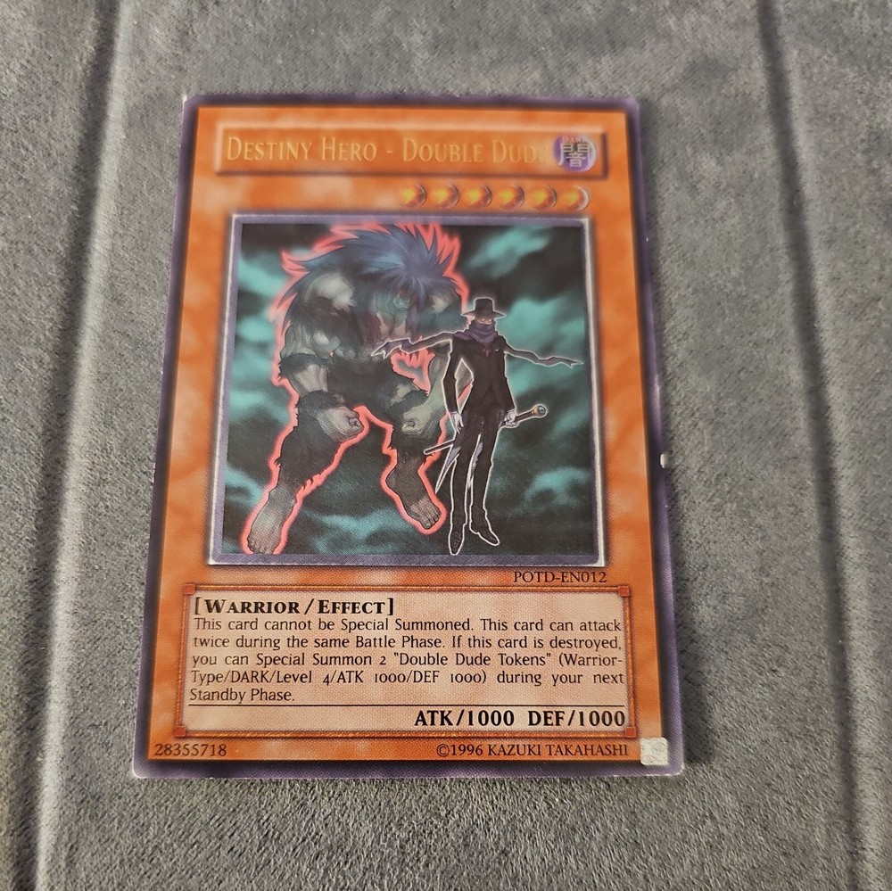 This Yu-Gi-Oh! TCG card is a DESTINY HERO - DOUBLE DUDE with the card number POTD-EN012. It is in near mint or better condition, making it highly sought after by collectors and players alike. As an Ultimate Rare card, it features a unique foil pattern that enhances its appearance and value. This card is a valuable addition to any Yu-Gi-Oh! card collection, particularly for fans of the Destiny Hero archetype.