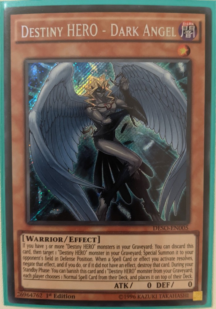 You are buying a Secret Rare, 1st Edition Destiny HERO - Dark Angel from DESO-EN005. Feel free to contact us if you have any Questions or Comments and we will get back to you ASAP. Our postage options: Domestic: Standard (Cheapest option) Domestic Tracked Letter (Tracked) Express (Tracked, fastest delivery) International: We currently only have Express and Registered (untracked with signature) postage due to delays caused by the current pandemic however if you interested in purchasing an item through Standard International Postage (Untracked) feel free to contact us. If you would like to combine postage over multiple items but are unable to please select the request total button or send us a message and we can help you out. Thanks for shopping with ChaosTCGAus! We Hope to see you again