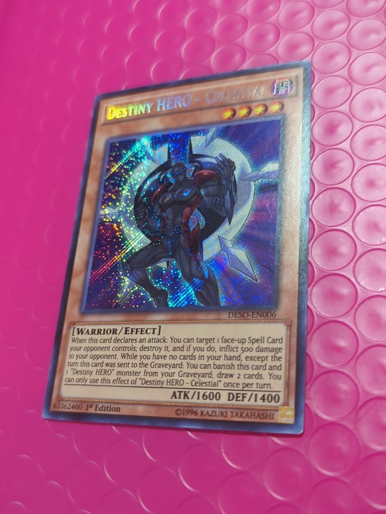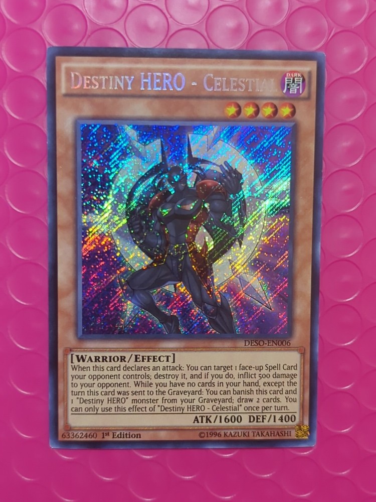 Yu-Gi-Oh! Destiny Hero - Celestial DESO-EN006 Secret Rare 1st Edition NM/VLP. The condition of this card is: Near Mint/Very Lightly Played *All cards sold will be inside of a penny sleeve and top load card holder. Packaging will be in a bubble envelope for extra protection.* **In an attempt to empty my collection, every order will come with a gift of additional sleeved cards of various conditions that may fit the theme/archetype (depending on what's remaining in my collection). The bigger the sale, the bigger the gift!**