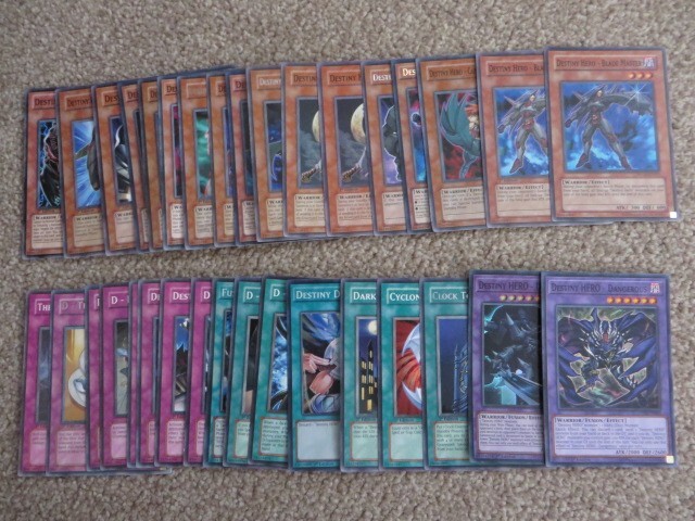 Yu-Gi-Oh! Deck Builder Card Set You will receive all the cards listed below and in the photo. This will help you to build a deck based on the above theme. All cards are genuine and are in excellent condition, unless otherwise stated Extra Deck Destiny Hero - Dangerous Common Destiny Hero - Dominance Super Monsters Destiny Hero – Blade Master Common X 2 1 is played condition Destiny Hero – Captain Tenacious Common Destiny Hero - Decider Secret Destiny Hero – Defender Rare Played condition Destiny Hero – Departed Common X 2 Destiny Hero – Diamond Dude Rare Played condition Destiny Hero – Dogma Super Destiny Hero – Doom Lord Common Destiny Hero – Double Dude Rare Destiny Hero - Drawhand Common Destiny Hero – Dread Servant Common Destiny Hero - Drilldark Super Destiny Hero – Dunker Common Destiny Hero – Fear Monger Common Destiny Hero – Plasma Common Played condition Spells Clock Tower Prison Rare Cyclone Blade Common Dark City Common Destiny Draw Super Played condition D – Formation Common D – Spirit Common Fusion Destiny Super Traps D – Chain Common Played condition Destiny Mirage Common Destiny Signal Common Destruction of Destiny Rare D – Fortune Common D – Shield Common D – Time Rare The Paths of Destiny Common Card Condition Mint/Near Mint - Card is in perfect Condition. Excellent - Card has no visible edge or corner wear but may have some very light surface wear/scratches, which are not visible when the card is in a clear sleeve. Very Good - Card has slight edge and/or corner/surface wear, which will be hardly visible when the card is in a clear sleeve. Light played - Card has more visible edge and/or corner/surface wear, but will still be playable in a clear sleeve. Played - Card will have edge and/or corner wear but will still be playable in a sleeve. None of the cards I sell will have any major bends, tears or stains unless noted in the listing. Cards will be securely packed to prevent damage.