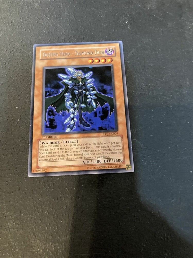 Yu-Gi-Oh Destiny Hero Diamond Dude Ultimate Rare 1st Edition EOJ-EN003 VLP. Condition is "Used". Dispatched with Royal Mail 2nd Class. Listing and template services provided by inkFrog