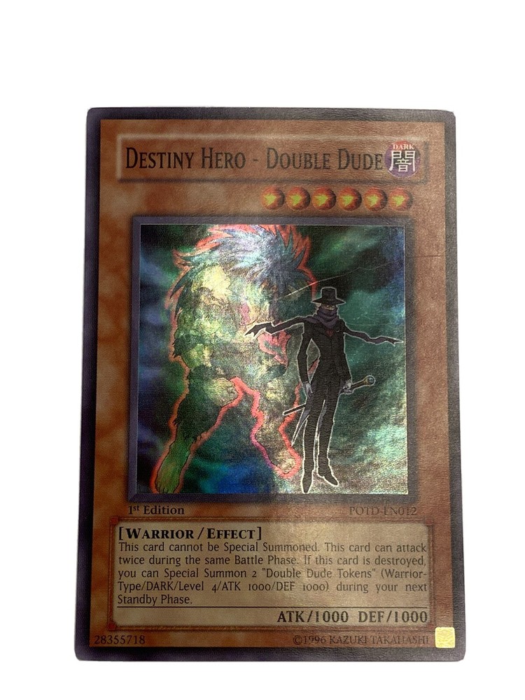 Selling one Destiny Hero - Double Dude POTD-EN012 1st Edition Super Rare. Condition is near mint - other than the small scratch on the front of the card. Very good edges and corners. Please see photos of the listing and judge for yourself. Shipped with care via Canada Post. No returns or refunds.