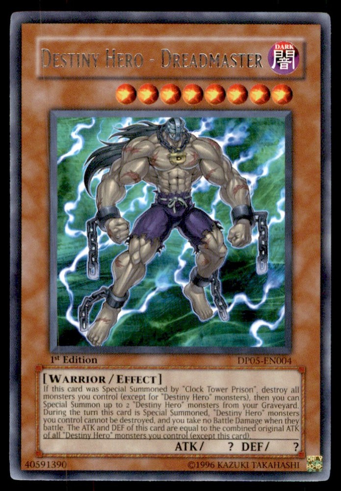 About Me Other Listings Feedback Add to Favorites Contact Me Bluenose Yu-Gi-Oh! Destiny Hero - Dreadmaster #DP05-EN004 1st Edition Near Mint No stock photo / These are real scans or pictures Details Description: Destiny Hero - Dreadmaster Category: Yugioh Year: 1996 Product: Yu-Gi-Oh! Card Number: DP05-EN004 Special: 1st Edition Near Mint Dimensions: 3¼" x 2¼" SKU: YU B0004 R01 Q (20) Payment Payment for buy it now is required immediately and for auctions it must be paid within 72 hours. Shipping Shipments usually make their way out in 1-2 business days. Returns and Claims Please view listing photo and description prior to purchase of card to make sure the card and condition is right for you! About Us Please keep in mind the following conditions .-------------------------------------------Near Mint: a card that shows very little to no signs of ware or usage such as very little whiting. -------------------------------------------Light Play: A card that shows signs of ware such as but not limited to whiting, slight bend or scratches. -------------------------------------------Heavy Play: A card that shows signs of ware, whiting, bending, creasing, folding or other various issues.-------------------------------------------Damaged: a card in very bad condition can have some or all of the above mentioned condition notes including peeling, stains, writing, etc.-------------------------------------------The photo in ads are the EXACT card you will recieve. Listing By Kronocard trading cards software v2.8.2.3