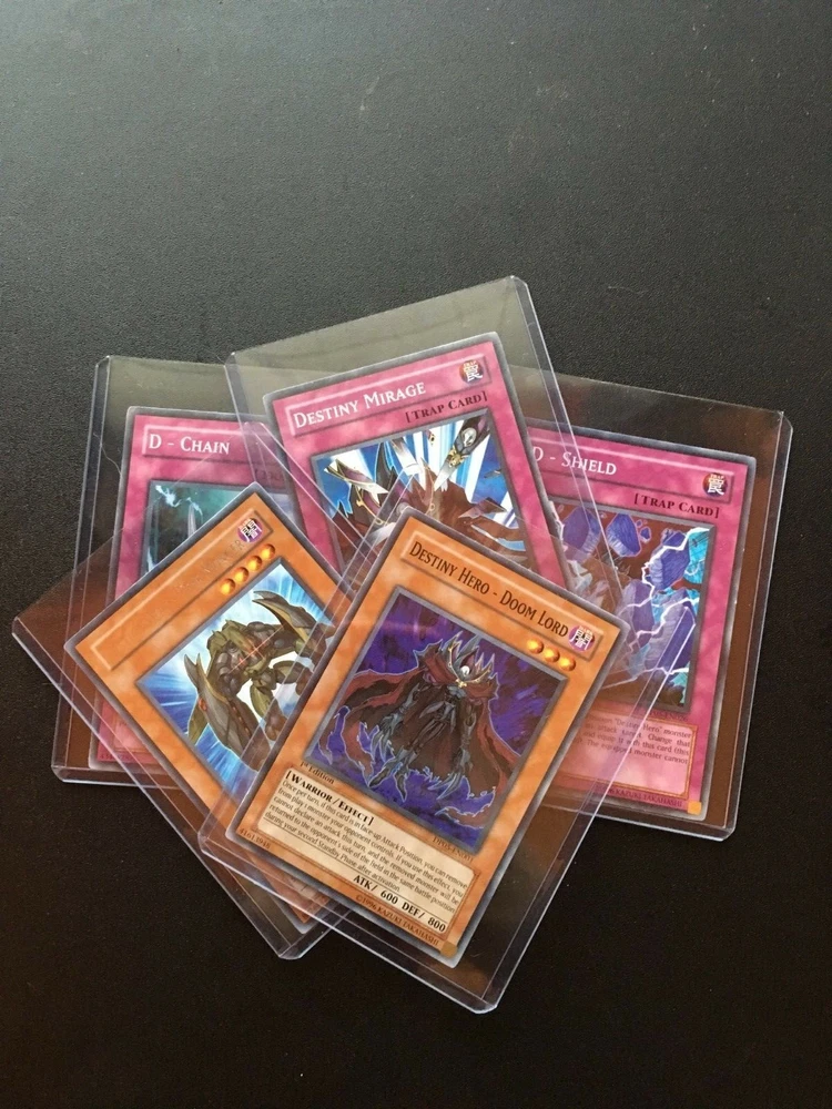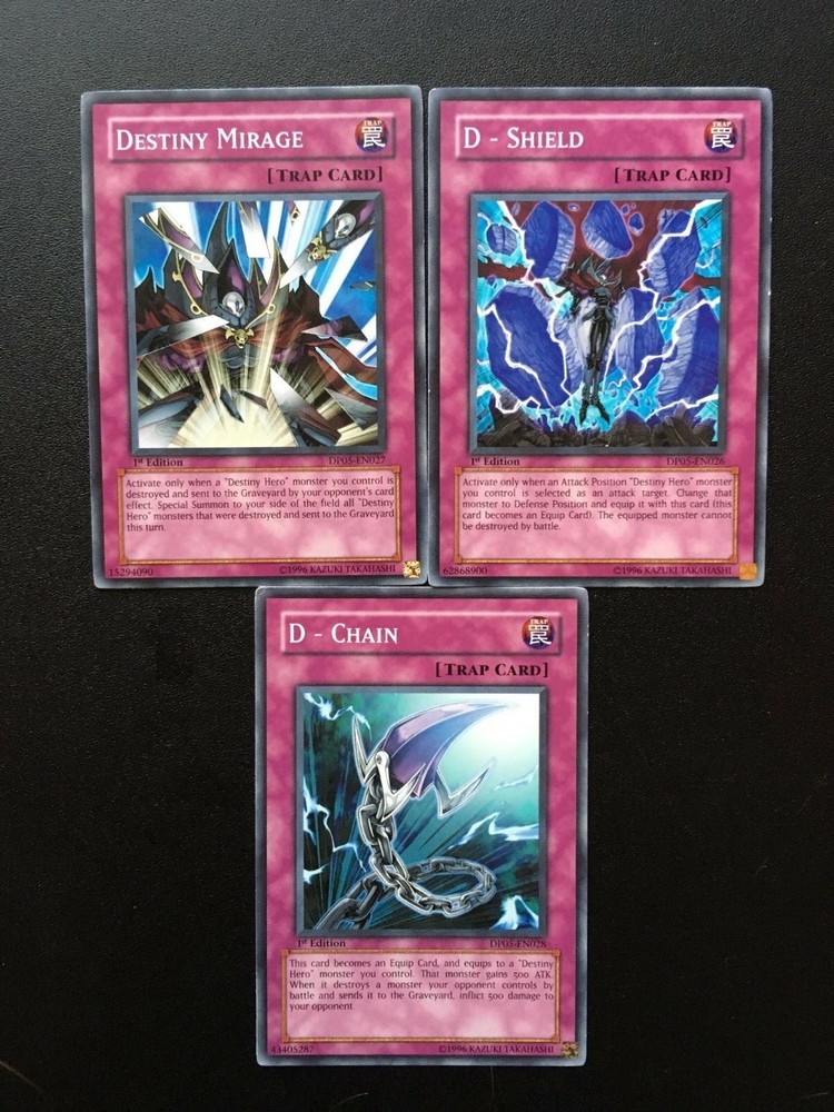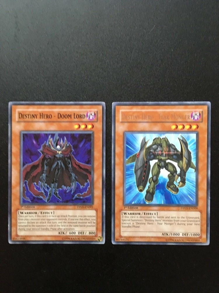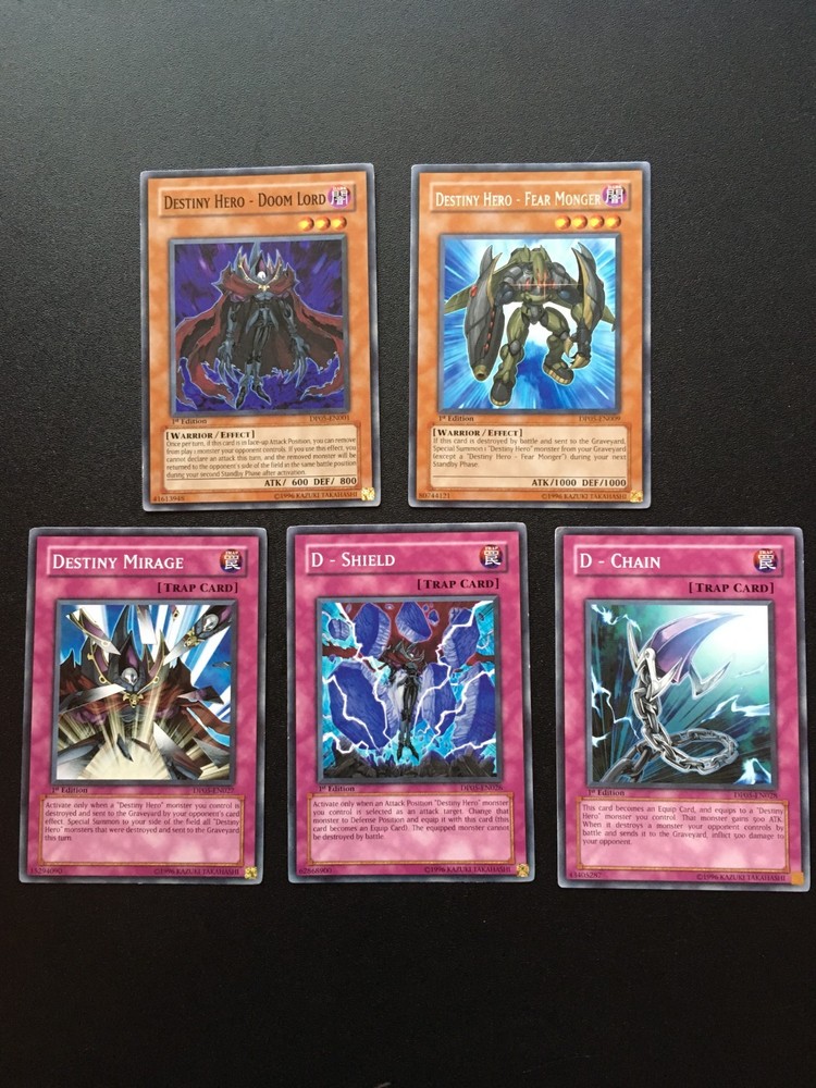 Lot of Destiny Hero cards, all 1st Edition in NM condition from DP05 (Duelist Pack: Aster Phoenix). Each card will ship in its own toploader. Includes: Destiny Hero - Doom Lord Destiny Hero - Fear Monger (RARE) Destiny Mirage D - Shield D - Chain