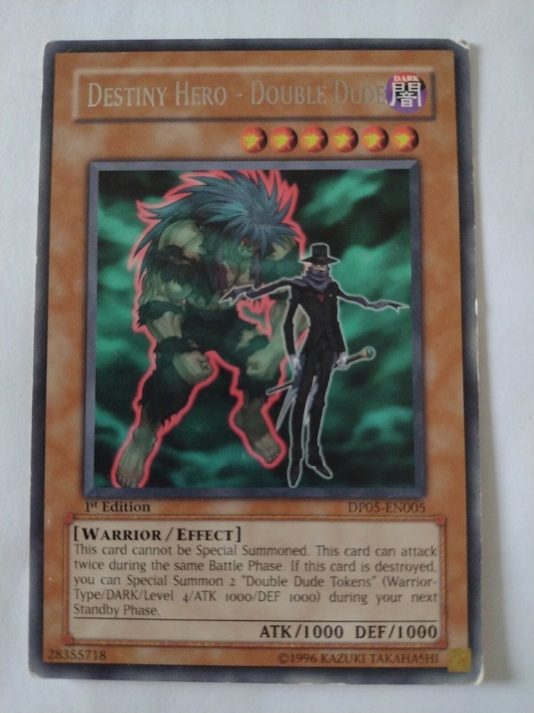Yu-Gi-Oh - Destiny Hero-Double Dude - DP05-EN005 - Rare - 1st Edition lp. Condition is light/moderate play (see photos). I will send the card in a card sleeve and pack it well to avoid damage. Please, do look at the other YUGIOH cards I have listed.