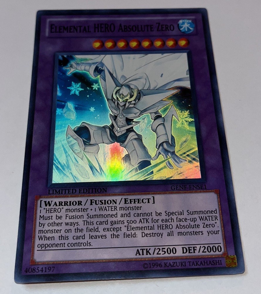 ELEMENTAL HERO, ABSOLUTE ZERO - GENF-ENSE1 en super La carte est en anglais, comme neuve (near mint to mint) Je suis un vendeur sérieux. Envoie en recommandé pour plus de sécurité :) International bidders are welcome.