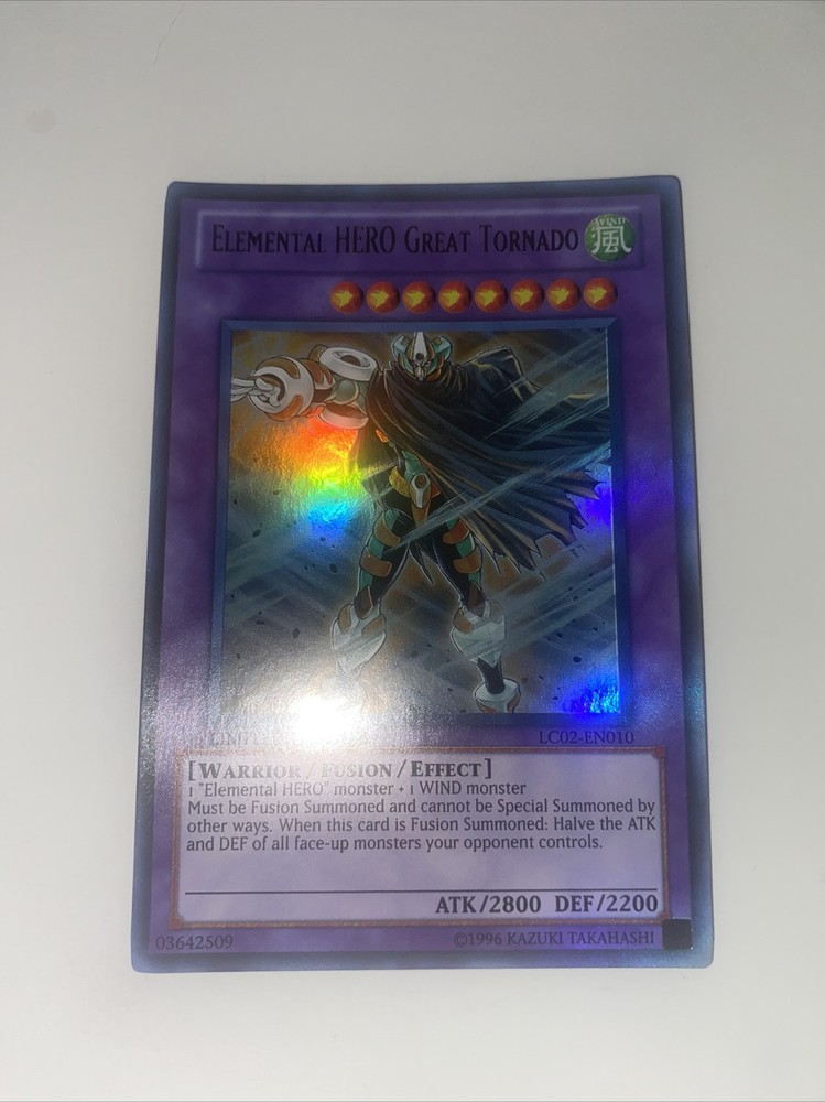 ELEMENTAL HERO GREAT TORNADO - LC02-EN010 en ultra limited édition Les cartes sont en anglais, en très bon état (near mint to mint) Je suis un vendeur sérieux. Envoie en courrier suivi pour plus de sécurité :) International bidders are welcome.