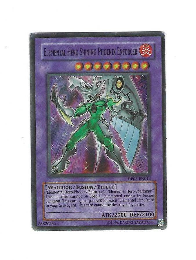 Yu-Gi-Oh! "Elemental Hero Shining Phoenix Enforcer" foil card designated DP05-EN013. Moderately played condition (VG). Actual item pictured. Don't miss this sharp Elemental Hero Shining Phoenix Enforcer card for your Yu-Gi-Oh! gaming collection!! Buyer pays $4.50 USPS 1st Class shipping in the United States (international extra). Seller combines shipping on multiple auction wins (cards 1-5 ship for $4.50). To assure combined shipping, please wait for Seller to send an invoice.