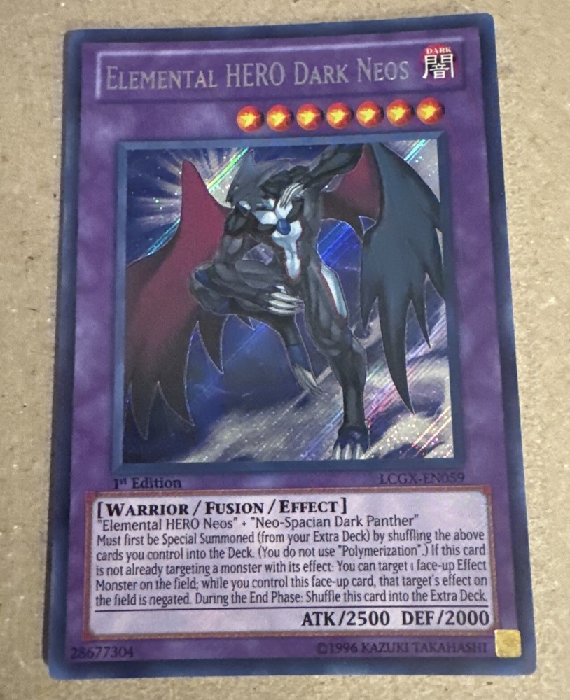 YuGiOh! Elemental HERO Dark Neos LCGX-EN059 Secret Rare 1st Edition. Few mild scratches on the back. ***I will consider REASONABLE offers. If you offer 50% off or more I will not consider that a reasonable offer, and will be less likely to consider a lower price. Please do not ask me for a best price and counter with something way lower. I do combine shipping but do not ask for a shipping discount on a single item. We calculate shipping based on weight, size, and location.