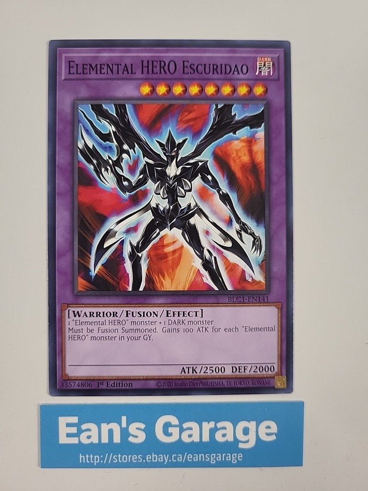 Yu-Gi-Oh! Elemental HERO Escuridao 1st Edition Common Battles of Legend: Chapter 1 BLC1-EN141 Condition: Mint Details (+): Bright and glossy colors, firm and flat, no tearing, no stains, no folds NOTES: All our cards are new and never been played All cards include a rigid Toploader card holder and a clear protective sleeve Please see pictures and read the information below SAVE ON SHIPPING! COMBINED SHIPPING SAVINGS APPLY AUTOMATICALLY WHEN YOU ADD MULTIPLE ITEMS TO YOUR SHOPPING CART PLEASE READ OUR WARRANTY, SHIPPING AND RETURNS POLICIES BELOW · Condition and grading: · We provide our best judgement based on general comic grading standards, we are not professional or certified graders. · FA: (Fair) Lots of problems, stains, big chunks missing, loose pages, split spline, etc. · GD: (Good) some wear and tear, small tears or small pieces missing, heavy roll on spline · VG: (Very Good) little wear and tear, little gloss, some creases and small folds, yellowish pages, some minor damage on spline but pages are all attached · FN: (Fine) very little wear, minor creases or folds, some stress marks on spline · VF: (Very Fine) minor wear, firm and flat spline, minor folds or bends · NM: (Near Mint) looks glossy and new, firm and flat, very minor marks · MN: (Mint) almost perfect condition · Gem Mint: perfect condition.... Warranty Contact us if you have any issues with an order as your first step, we will do our best to resolve any problems in a fast and professional way. We have done our best to describe the items we sell as accurate as possible, again, if you have any questions, please ask before shopping Our games and movies are tested so we guarantee they are in good operational condition, regardless, if any issues arise within 48 hours after receiving your items, please contact us. There is no guarantee for any download codes or it's validity and in many cases we ignore if they would've been part of the original package, therefore: No download codes, skins or manuals are included unless noted otherwise. Shipping We combine shipping Within Canada and the U.S: Canadapost Lettermail or Small Packets USA air are our default - transit time can be up to 15 business days (Monday thru Friday) depending on your location. Transit time and Customs clearing are beyond our control. International shipping options may vary depending on your location and might take up to 4 weeks depending on the shipping service you select and it's availability, again, transit time and Customs Clearing are beyond our control. For faster and traceable services please pick Expedited, Express or Priority. Regular letterpost and most Economy services DO NOT include a tracking number We ship within 48 hours (Monday thru Friday), this means that we take your parcel to the postal office, beyond that point is up to the carrier (Canadapost, FedEx or UPS) Please consider these facts when leaving feedback and rating us since we are not the operators. Orders placed on Friday after 3 pm, Saturday or Sunday will be shipped on Monday. Returns 1.- Contact us 2.- Let us know what is the problem immediately after receiving 3.- Only valid reasons for a return are: wrong item or defective item 4.- Do not unpack or use the item(s) 5.- Item(s) must be returned in exact condition as they were shipped by using a traceable postal service Track Page Views With Auctiva's FREE Counter