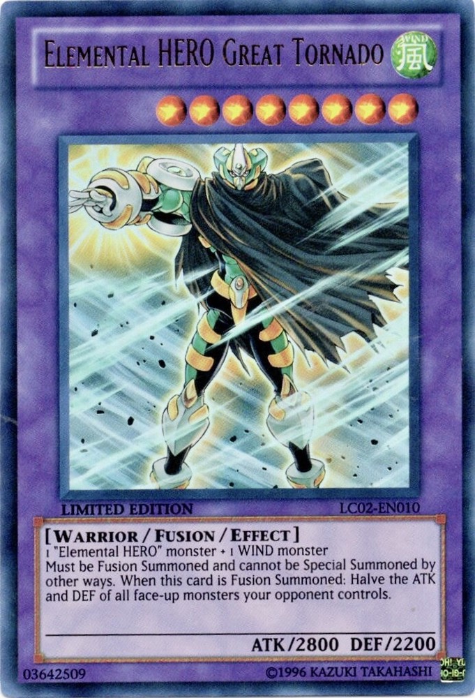 The product is a Yu-Gi-Oh! trading card called "Elemental HERO Great Tornado" from the Legendary Collection 2: The Duel Academy Years set. It is an Ultra Rare limited edition card with the attributes of Wind element, Warrior monster type, 2800 Attack/Power, and 2200 Defense/Toughness. Manufactured by Konami, this English language card is part of the Yu-Gi-Oh! TCG game and falls under the Fusion and Effect card types, bearing the card number LC02-EN010.