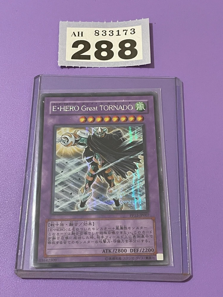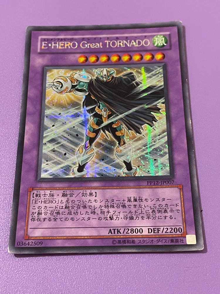 Hello and welcome to my auction. Yu-Gi-Oh! Elemental HERO Great Tornado Secret Rare PP12-JP007 Japanese card. The card is in moderate condition with some heavy marks on the back. This card comes in a sleeve and protective Top Loader / case. Please check out the photos for detail of condition and any imperfections. Please check out my other YuGiOh! Cards and Collectable items as more are added regularly. All item/s are sold as seen, What you see is what you get I offer postage discounts on multiple wins If you have any questions please feel free to contact me and i will respond within 24 hours Payment within 3 days of auction ending please Items will usually be dispatched within 3 working days after receiving cleared payment. Many thanks and good luck