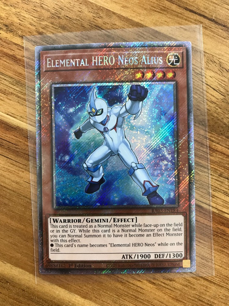 Unleash the power of Gemini with the Yu-Gi-Oh! Elemental Hero Neos Alius card, a Platinum Secret Rare gem from the Quarter Century Bonanza 25th Anniversary set. As a Warrior-type card, Neos Alius comes equipped with an impressive 1300 defense and a striking 1900 attack, ready to take on any challenger in your next duel. Konami's craftsmanship shines through with this card's holographic finish, capturing the essence of its Light attribute. With card number RA03-EN184, this 1st Edition Neos Alius is a must-have for collectors and players alike, seeking to bolster their deck with a formidable and rare warrior.