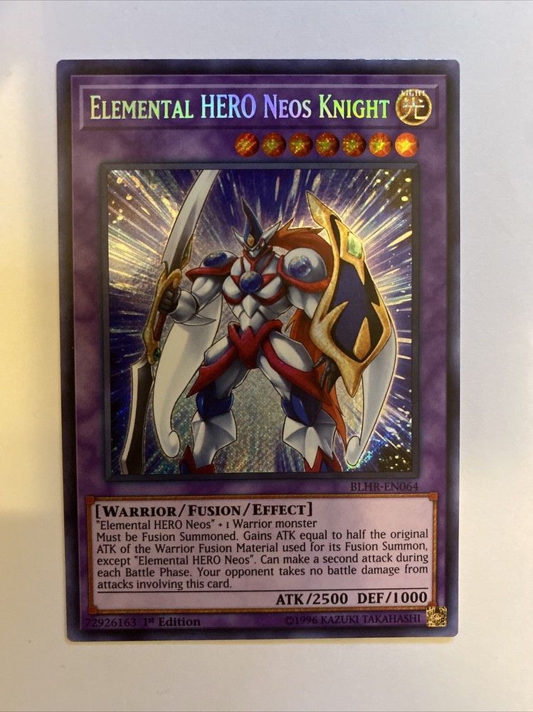 Yu-Gi-Oh! Elemental HERO Neos Knight - BLHR-EN064 - NM 1st Edition Secret Rare. Condition is "Used". Shipped with USPS First Class. Near Mint: General: A Near Mint card should look Mint but on closer inspection will have a minor flaw either on an edge, a corner, or its surface. A Near Mint card is allowed to have a few small dings or a small chip. Corners: The corners on a Near Mint card should be crisp but one or two may have a small flaw such as a small ding. All cards are sleeved right after being pulled out of a pack.