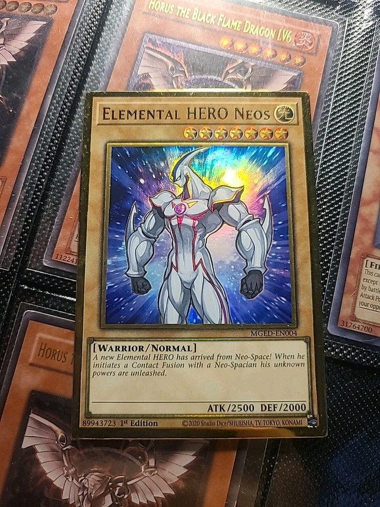 This is a rare and highly sought-after Yu-Gi-Oh! TCG card featuring the Elemental HERO Neos from the Maximum Gold: El Dorado set. The card is a 1st Edition Premium Gold Rare with a holographic finish, making it a must-have for any serious collector. It is in perfect condition and has never been played. The card features the warrior creature/monster type and has light attributes. It is in English language and has the card number MGED-EN004. The card size is Japanese and was manufactured by Konami. Don't miss your chance to add this valuable card to your collection!