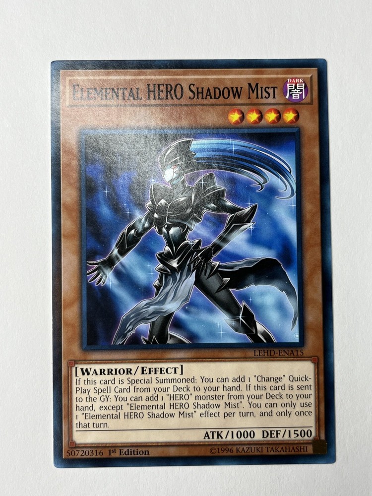 This Yu-Gi-Oh! card is a must-have for fans of the game. The Elemental HERO Shadow Mist card, from the Legendary Hero Decks - Destiny HERO Deck, features a Dark, Warrior monster with 1500 Defense and 1000 Attack. The card is a Common rarity, 1st Edition, and is in Near Mint condition. The card is an Effect type with card number LEHD-ENA15, and is in English language. The manufacturer is Konami and the finish is Regular. This card is perfect for collectors and players alike and is sure to be a valuable addition to any collection. Comes with a card sleeve protector.
