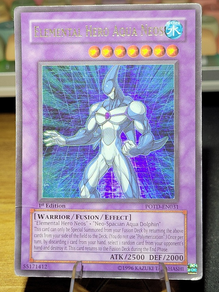 Selling Yugioh Card: Elemental Hero Aqua Neos (POTD-EN031), 1st Edition, Ultra Rare rarity, VLP condition (please reference the photos as I am not an expert or a card grader). Super fast and secure shipping provided, shipping guaranteed within 2 business days of purchase! I want you to purchase with confidence, so please feel free to contact me with any questions regarding the cards. Check out my other listings for more Yugioh cards at fair prices.