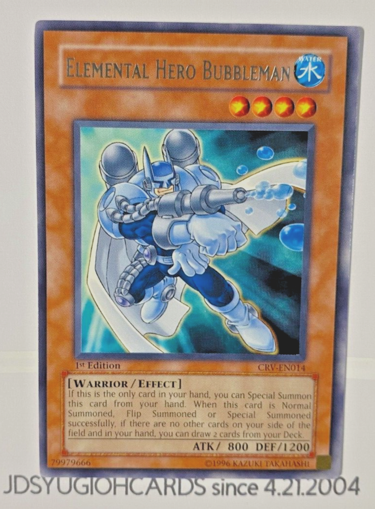 So, I came across my YUGIOH CARD COLLECTION, so decided to sell them like I did about 17 years ago. None of my cards have ever been played with unless otherwise stated. This listing is for "ONE" YuGiOh card : Elemental Hero Bubbleman 1st Edition CRV-EN014 (Rare) MINT/NEAR MINT This card is in MINT/ NEAR MINT. The picture of the card is what you will be purchasing. Grading Scale Mint - Pack Fresh New! Fresh Clean Card with No Visual Imperfections Near Mint (NM) - Overall, Pretty Good. May have very minor imperfections/play ware/light scratches Light Play (LP) - Card will have noticeable play ware AND OR light scratches OR possibly a small crease/dent(s) if the rest the card is in great shape Moderate Play (MP ) - Card will have a more considerable amount of play ware AND OR crease(s). Heavy Play (HP) - Card will have significant play ware/creases, may have other damages such as scratches, water damages etc. Damaged (DMG) - Very significant damages, such as creases, play ware, scratches, bends/tares but NO missing pieces. No cards with missing portions will be up for sale unless included in an auction as a lot sale For more information on any of my card's condition, shipping info, or any other questions, PLEASE feel FREE to message me. SHIPPING CALCULATOR: They are exact charges plus $1.50 handling fee, for packaging and misc. costs. If you feel there is an error, please email me. Payments not received within 7 days will be automatically revoked and relisted. We do combine shipping it is an additional $1.50 and up (depending on the item/s) off of each item/s original S&H that it would actually be. If you do not agree with any of our policies for any reason, including, how we ship, and what the charges are or anything else, we respectfully request that you do not bid on our auctions. Thank You in Advance! This card is Tournament Legal and is an Konami English/American card. Thank you :)