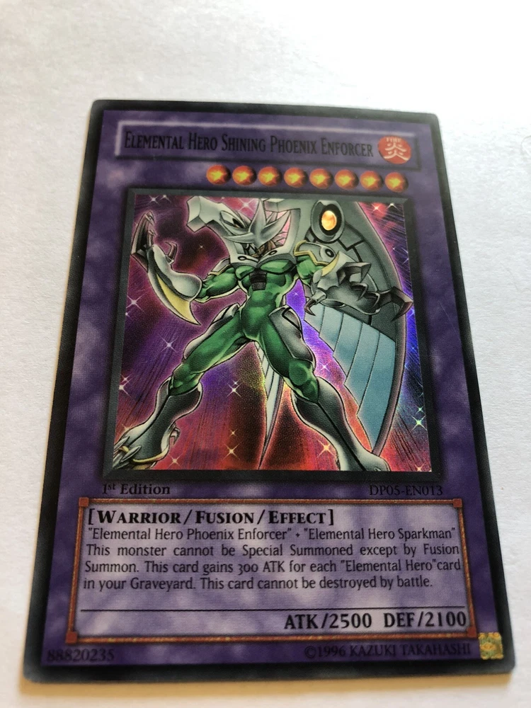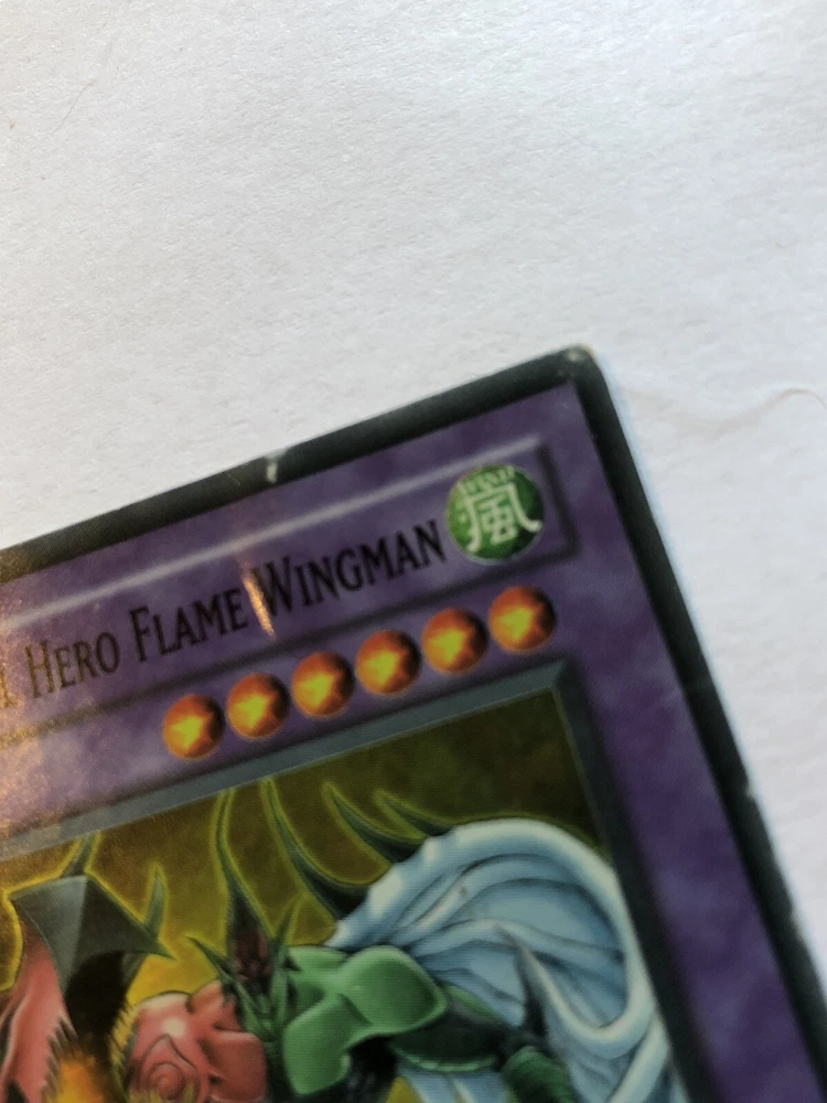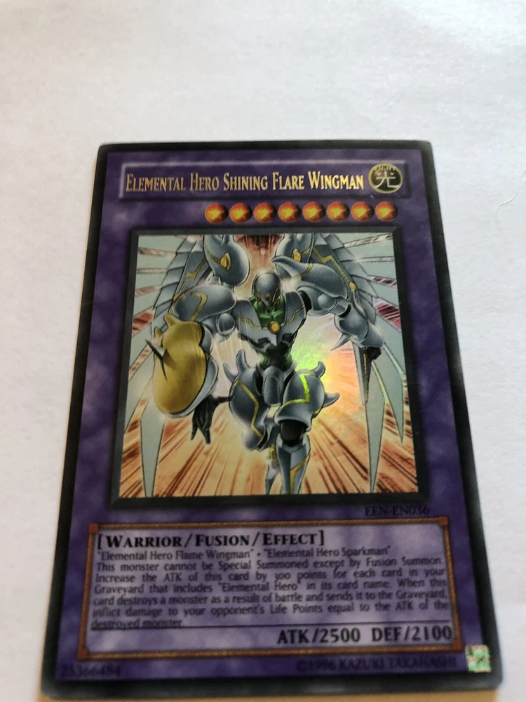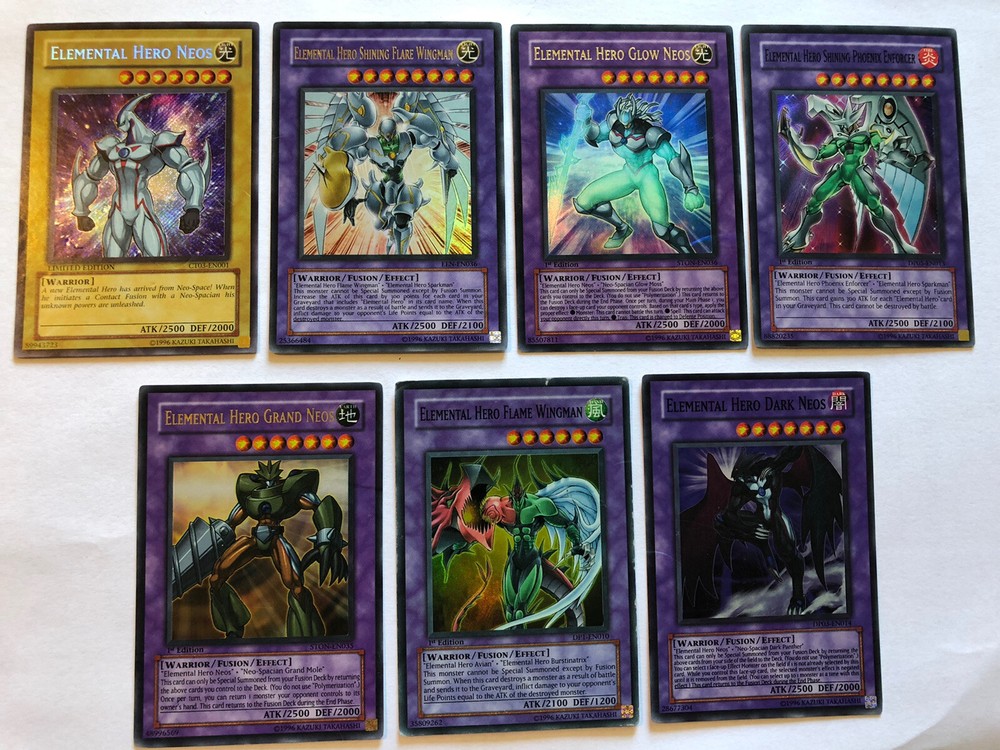 6 in totalYu-Gi-Oh Elemental Hero Cards, 6 in total. Elemental Hero Neos, Limited Edition CT03-EN001, moderately played condition. Some indentations on face of card that are hard to pick up with camera Elemental Hero Shining Flare Wingman EEN-EN036, lightly - moderately played. Only damage is slight scratching on face of card Elemental Hero Glow Neos, 1st edition, STON-EN036, Lightly - Moderately Played. Only Damage is crease on right side about 1cm in length Elemental Hero Shining Phoenix Enforcer, DP05-EN013, 1st edition, Lightly Played. No noticeable damage, scratches, or creases Elemental Hero Dark Neos, DP03-EN014, Lightly - Moderately Played . Small crease on left side and top of card Elemental Hero Grand Neos, STON-EN035, Lightly – Moderately Played, 1 st edition. Small crease on right side o f card Elemental Hero Flame Wingman, DP1-EN010, 1 st edition, Moderately Played, crease on right side of card
