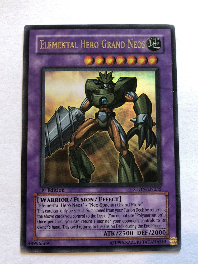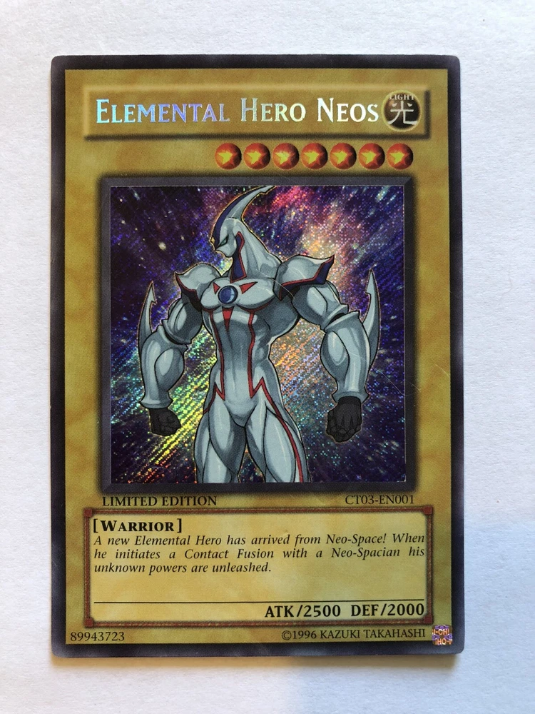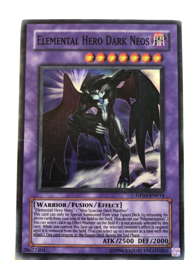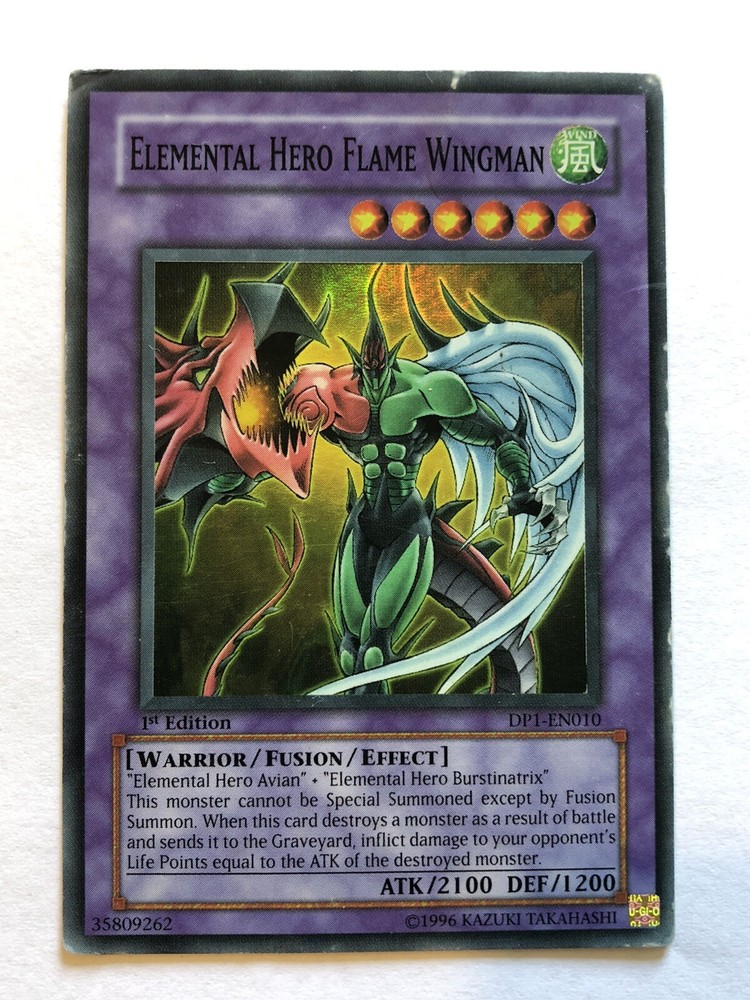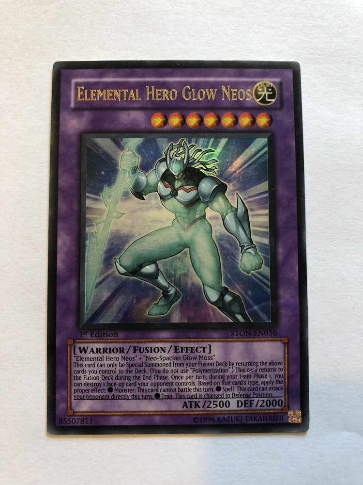 6 in totalYu-Gi-Oh Elemental Hero Cards, 6 in total. Elemental Hero Neos, Limited Edition CT03-EN001, moderately played condition. Some indentations on face of card that are hard to pick up with camera Elemental Hero Shining Flare Wingman EEN-EN036, lightly - moderately played. Only damage is slight scratching on face of card Elemental Hero Glow Neos, 1st edition, STON-EN036, Lightly - Moderately Played. Only Damage is crease on right side about 1cm in length Elemental Hero Shining Phoenix Enforcer, DP05-EN013, 1st edition, Lightly Played. No noticeable damage, scratches, or creases Elemental Hero Dark Neos, DP03-EN014, Lightly - Moderately Played . Small crease on left side and top of card Elemental Hero Grand Neos, STON-EN035, Lightly – Moderately Played, 1 st edition. Small crease on right side o f card Elemental Hero Flame Wingman, DP1-EN010, 1 st edition, Moderately Played, crease on right side of card