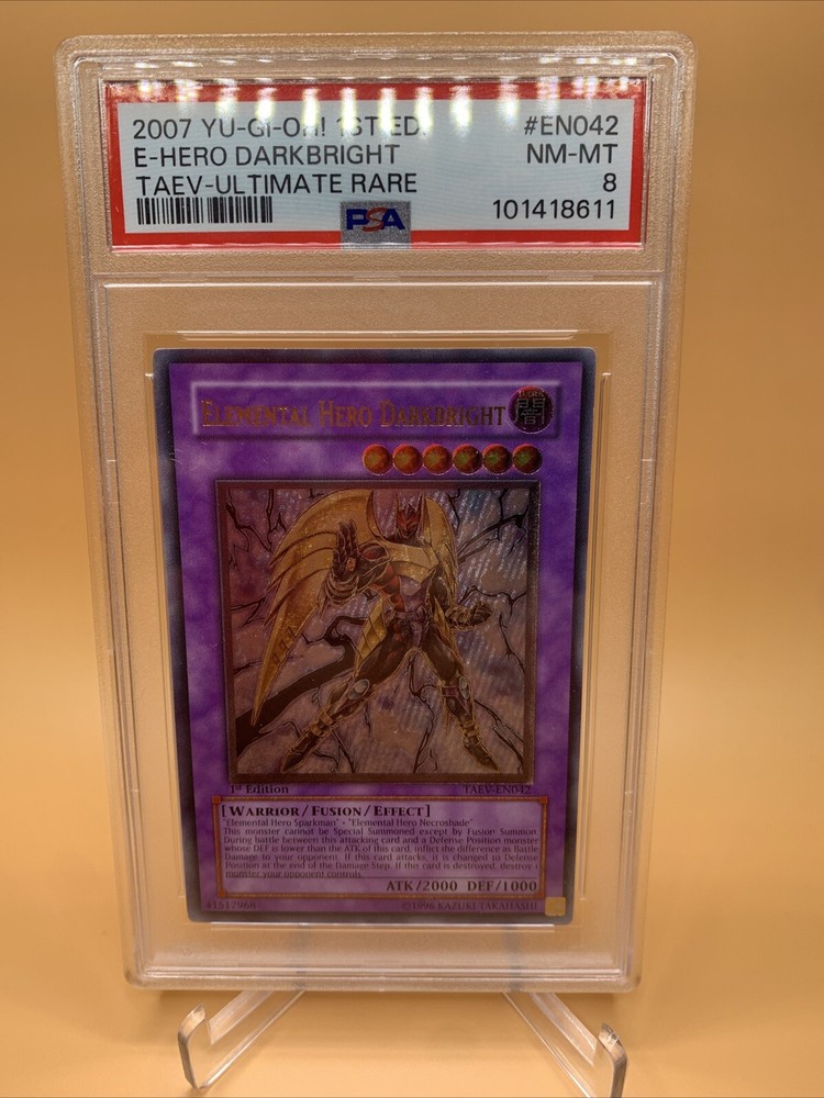 YuGiOh Elemental Hero Darkbright TAEV-EN042 1st Edition PSA 8 NM-MT. Condition is Graded. Shipped with USPS Ground Advantage.