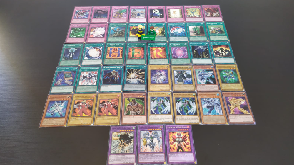 Yu-Gi-Oh! Konami Elementarhelden Deck ~ Deckliste ~ Monster 1x Maskierter Held Goka *holografisch - Rare* 1x Elementarheld Glänzender Flügelmann 1x Elementarheld Großer Tornado 1x Elementarheld Neos 2x Elementarheld Burstinatrix 1x Elementarheld Clayman 2x Elementarheld Avian 1x Elementarheld Sparkman 1x Elementarheld Wildheart 1x Elementarheld Bubbleman 1x Elementarheld Neo-Bubbleman 1x Elementarheld Another Neos 1x Elementarheld Bladedge Zauber 1x Maskenwechsel *holografisch - Ultra Rare* 1x Der lebendig heimkehrende Krieger *holografisch - Rare* 1x Heldenmaske 1x Ein Held lebt 1x Verstärkung für die Armee 1x H - Heißes Herz 1x E - Eiliger Notruf 1x R - Rechtschaffenes Urteil 1x O - Oberseele 1x Umkehrung von Neos 1x Fusionsmarke 1x Wolkenkratzer 1x Federschuss 1x Falscher Held 1x Nachschubtrupp 1x De-Fusion 1x Fusion der Parallelwelten 1x Wunderfusion Fallen 1x Federwind *holografisch - Rare* 1x Heldenregel 2 *holografisch - Rare* 1x Heldentausch *holografisch - Rare* 1x Heldenexplosion 1x Wandel des Helden - Reflektorstrahl 1x Heldensignal 1x Zurück an die Front 1x Fehlpolymerisation 1x Ruf der Gejagten 1x Die Geburt eines Helden Bitte beachten Sie, dass: - alle meine Karten Original Konami sind. - die Karten wenn nicht anders angegeben, Deutsch oder Englisch sind. - Sie alle Karten bekommen, die in der Deckliste stehen bzw. auf dem Bild ersichtlich sind. - das Bild ein Originalbild ist. - dieses Deck legal ist und somit auf Turnieren oder gegen Freunde gespielt werden darf. Viele weitere Yu-Gi-Oh! Karten und mehr finden Sie unter "Weitere Artikel des Verkäufers". Die Legofiguren sind nicht Teil der Auktion, sie dienen lediglich der Präsentation Da Privatverkauf keine Garantie oder Umtausch