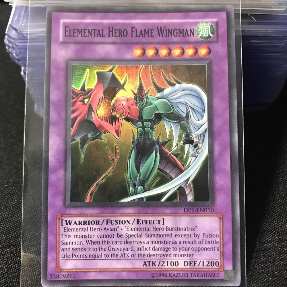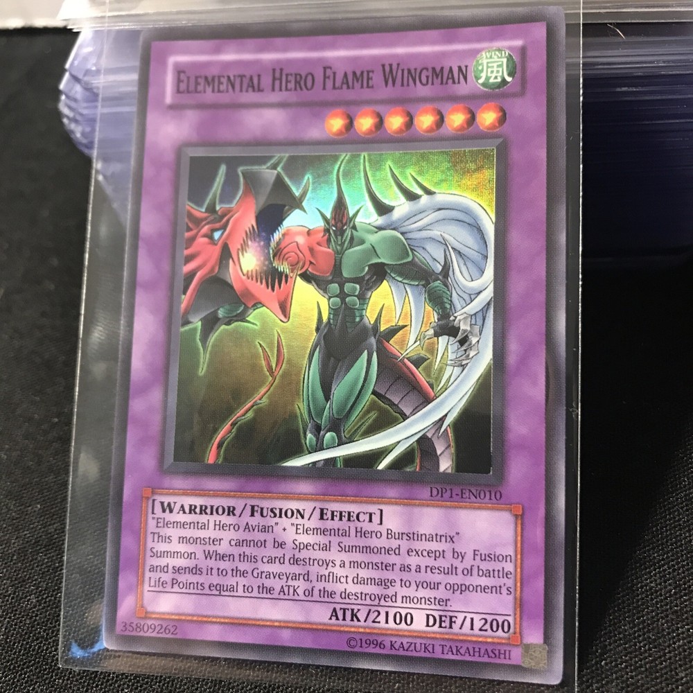 This Yu-Gi-Oh! trading card features the powerful Elemental HERO Flame Wingman, known for its exceptional rarity and strength. Summon this Flame monster to join your deck and dominate your opponents. Perfect for collectors of rare and valuable trading cards, this Super Rare card is in NM (Near Mint) condition. Enhance your collection with this Flame Wingman card and take your gameplay to the next level.