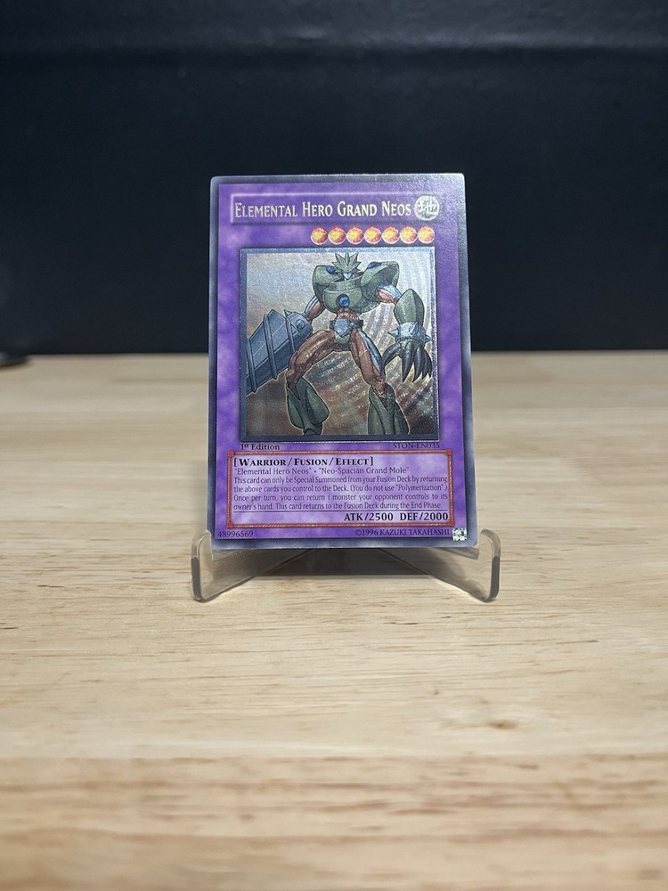 VLP-NM - Please carefully check over photos and message if you have any questions. Will ship sleeved in a top loader inside a team bag protected with cardboard inside a bubble mailer. Unleash the power of Elemental Hero Grand Neos, a must-have for any Yu-Gi-Oh! TCG collector or duelist. From the Strike of Neos set, this card bears the prestige of being an Ultimate Rare 1st Edition, featuring the distinguished card number STON-EN035. Its Fusion card type adds a unique capability to your gameplay, while its English language makes it a valuable piece for North American players. Proudly manufactured by Konami, this card is a testament to the rich lore and strategic depth of the Yu-Gi-Oh! universe. As an Ultimate stage card, it brings a significant advantage to your deck, provided you know how to harness its potential. Whether for competitive play or collection, Elemental Hero Grand Neos is a card that stands out.