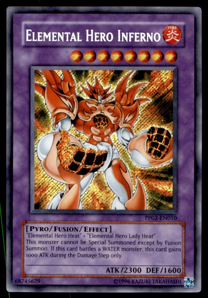 About Me Other Listings Feedback Add to Favorites Contact Me Bluenose Yu-Gi-Oh! Elemental Hero Inferno #PP02-EN010 Near Mint No stock photo / These are real scans or pictures Details Description: Elemental Hero Inferno Category: Yugioh Year: 1996 Product: Yu-Gi-Oh! Card Number: PP02-EN010 Special: Near Mint Dimensions: 3¼" x 2¼" SKU: YU B0004 R03 D (28) Payment Payment for buy it now is required immediately and for auctions it must be paid within 72 hours. Shipping Shipments usually make their way out in 1-2 business days. Returns and Claims Please view listing photo and description prior to purchase of card to make sure the card and condition is right for you! About Us Please keep in mind the following conditions .-------------------------------------------Near Mint: a card that shows very little to no signs of ware or usage such as very little whiting. -------------------------------------------Light Play: A card that shows signs of ware such as but not limited to whiting, slight bend or scratches. -------------------------------------------Heavy Play: A card that shows signs of ware, whiting, bending, creasing, folding or other various issues.-------------------------------------------Damaged: a card in very bad condition can have some or all of the above mentioned condition notes including peeling, stains, writing, etc.-------------------------------------------The photo in ads are the EXACT card you will recieve. Listing By Kronocard trading cards software v2.8.2.3