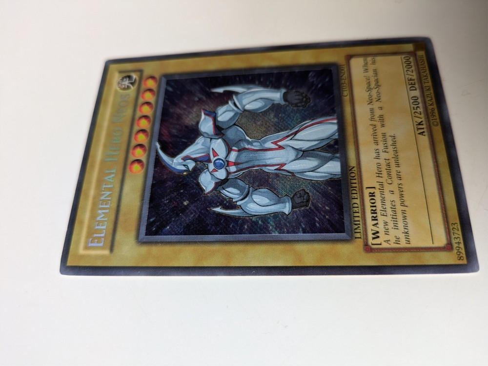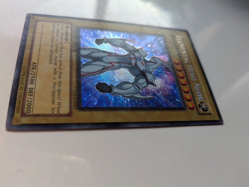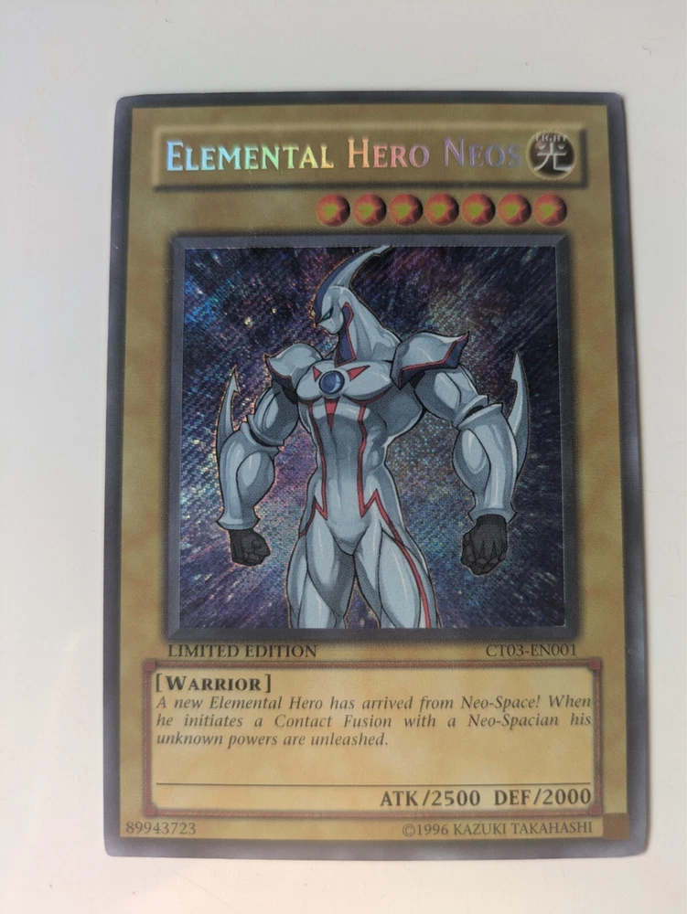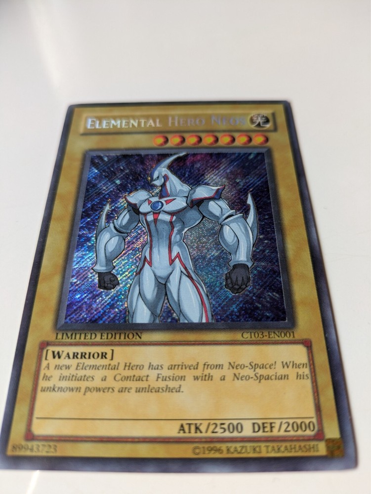 The product is a Secret Rare Limited Edition Elemental HERO Neos card from the Yu-Gi-Oh! TCG, specifically from the "- Yugi -" set. It is identified as card CT03-EN001 and was manufactured by Konami....