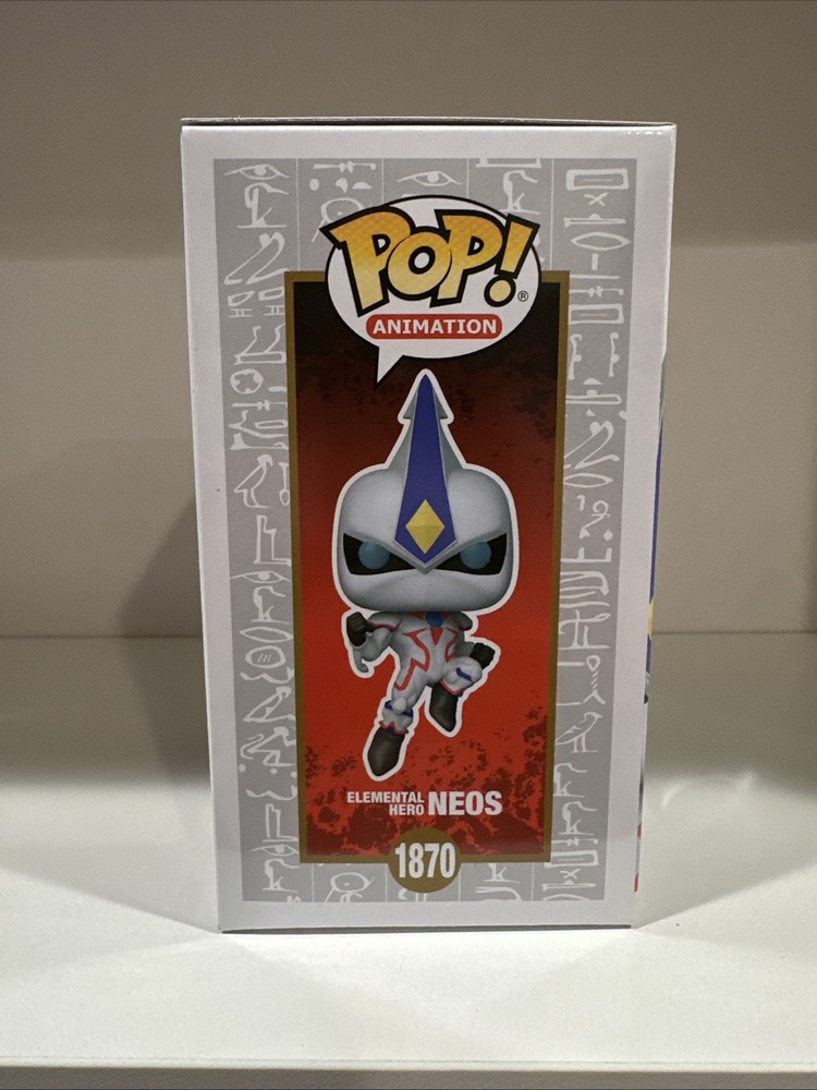 The product is a Funko Pop Vinyl Figure featuring Elemental Hero Neos from Yu-Gi-Oh! It is part of the Heroes collection and comes with a Pop Protector. The figure is #1870 in the Pop! Vinyl product line, made of vinyl material. It is an exclusive item from Funko, representing a hero character from the franchise.