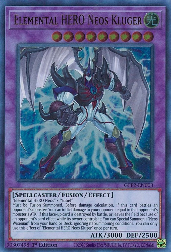 | Card Text | "Elemental HERO Neos" + "Yubel" Must be Fusion Summoned. Before damage calculation, if this card battles an opponent's monster: You can inflict damage to your opponent equal to that opponent's monster's ATK. If this face-up card is destroyed by battle, or leaves the field because of an opponent's card effect while its owner controls it: You can Special Summon 1 "Neos Wiseman" from your hand or Deck, ignoring its Summoning conditions. You can only use this effect of "Elemental HERO Neos Kluger" once per turn. |