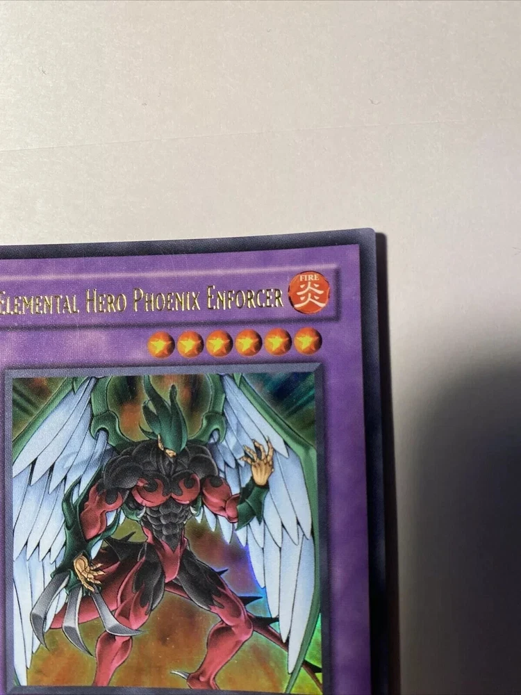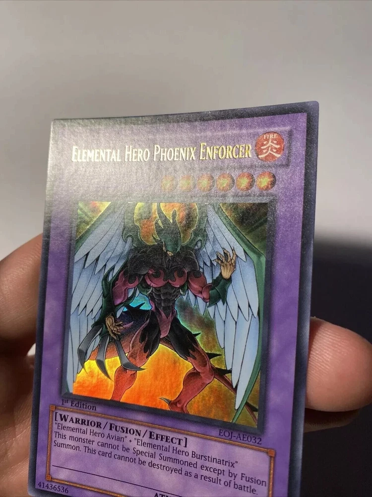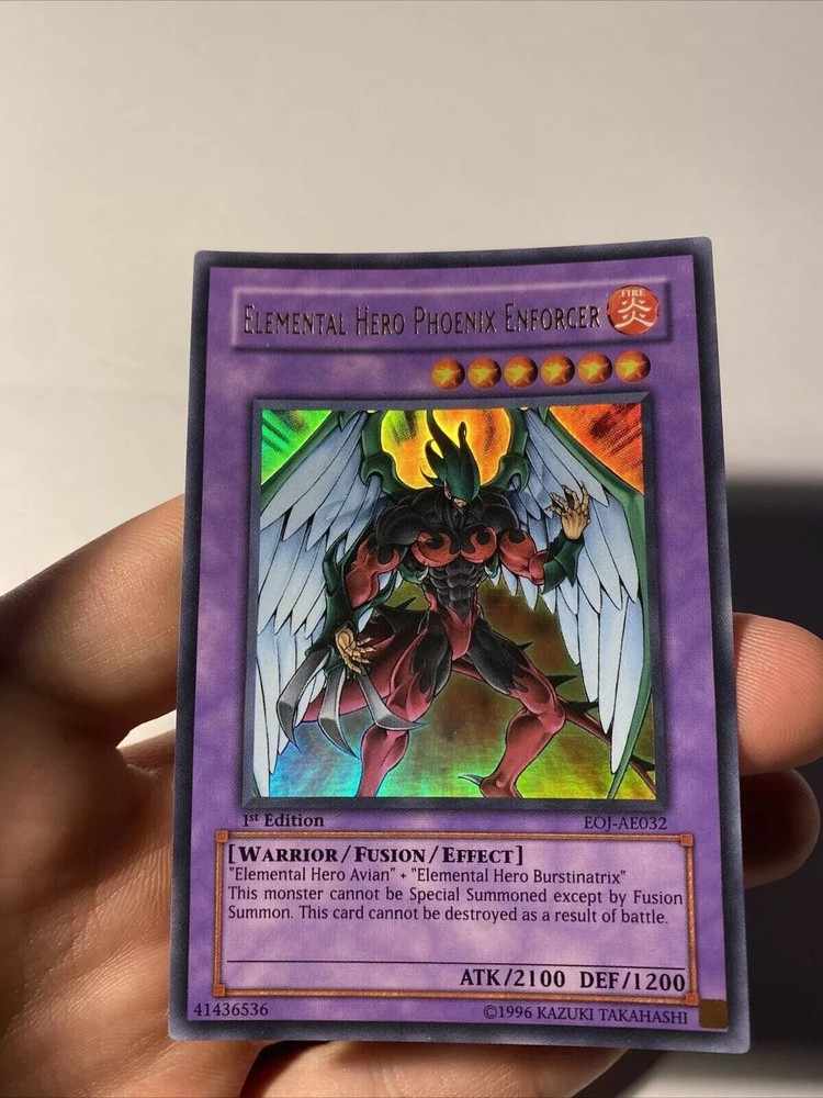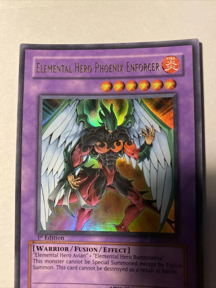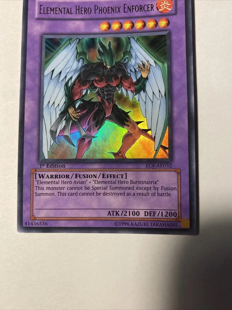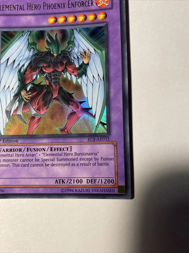 This Yu-Gi-Oh! card features Elemental HERO Phoenix Enforcer from the Yugi set, with the Asian English 1st edition EOJ-AE032. It is perfect for collectors of CCG individual cards, and specifically those who collect Yu-Gi-Oh! TCG. The card is ungraded, and the features include a 1st edition print. The language of the card is English. Overall, this is a great addition to any collection, particularly for fans of Yu-Gi-Oh! TCG who want to expand their collection by adding this rare card. The card is in excellent condition and would make a great gift for any collector. Great condition with a tiny bit of edge wear on the left side on the back of the card.