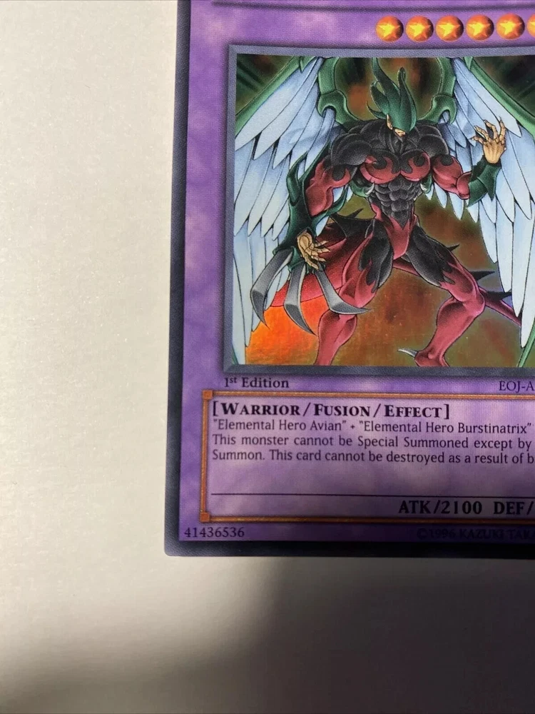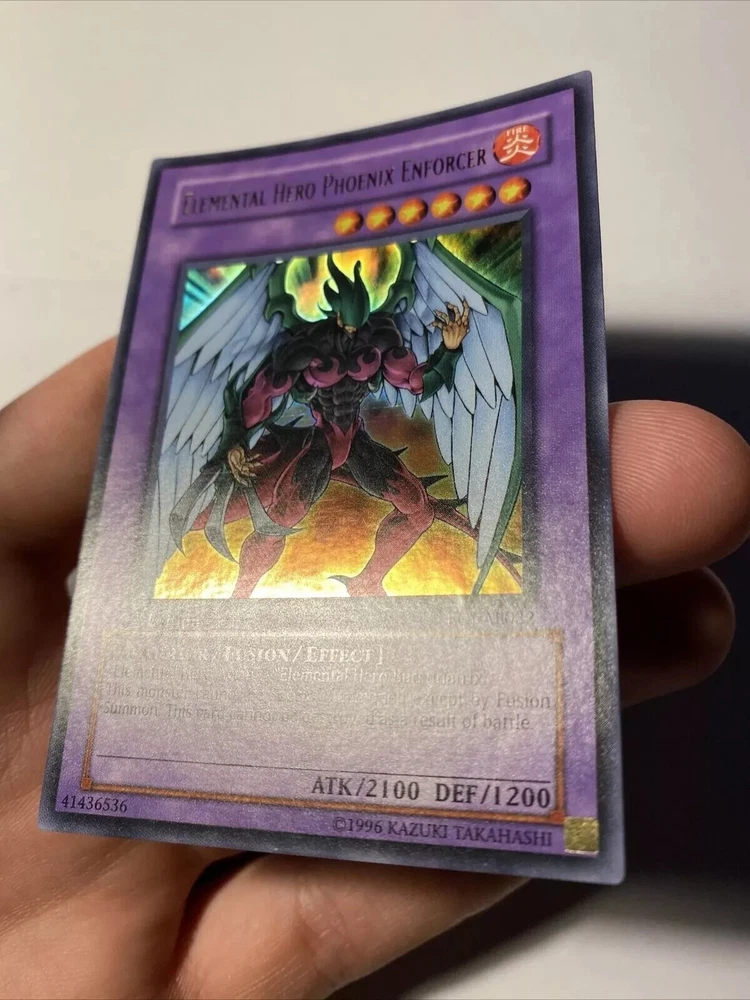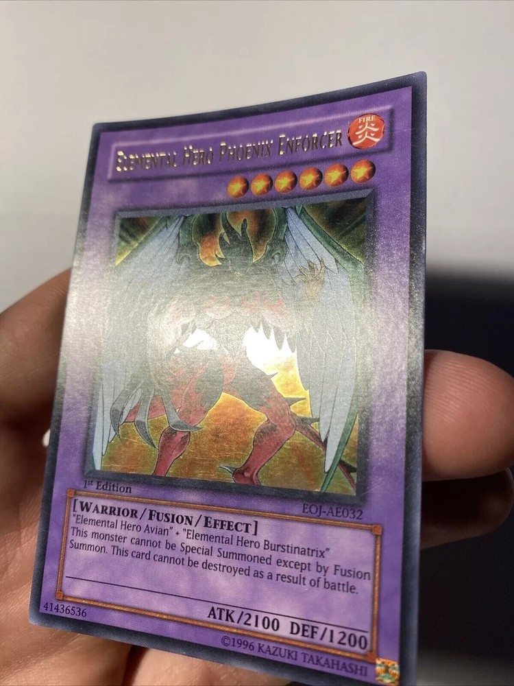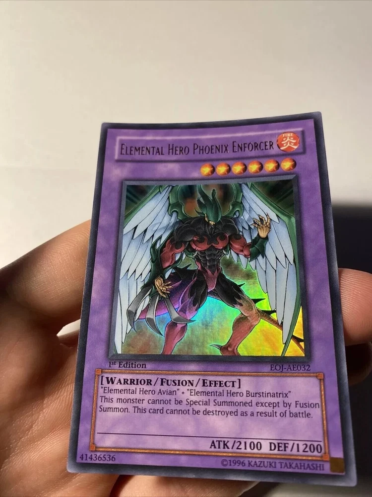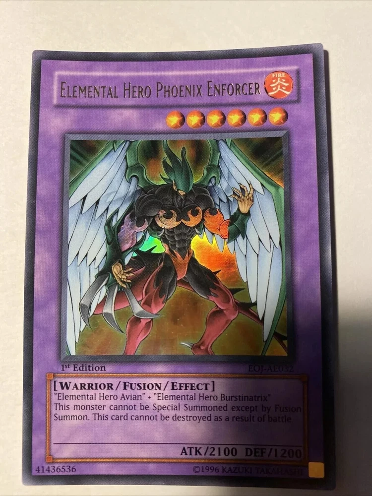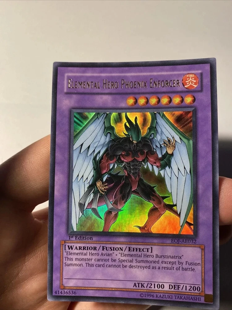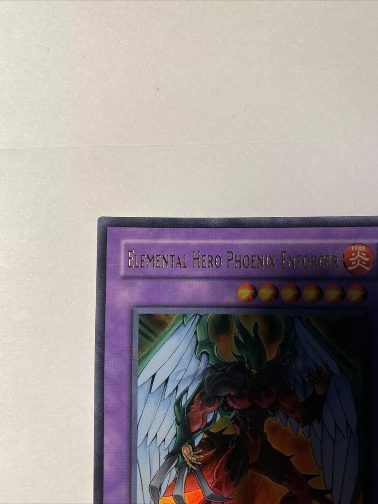 This Yu-Gi-Oh! card features Elemental HERO Phoenix Enforcer from the Yugi set, with the Asian English 1st edition EOJ-AE032. It is perfect for collectors of CCG individual cards, and specifically those who collect Yu-Gi-Oh! TCG. The card is ungraded, and the features include a 1st edition print. The language of the card is English. Overall, this is a great addition to any collection, particularly for fans of Yu-Gi-Oh! TCG who want to expand their collection by adding this rare card. The card is in excellent condition and would make a great gift for any collector. Great condition with a tiny bit of edge wear on the left side on the back of the card.