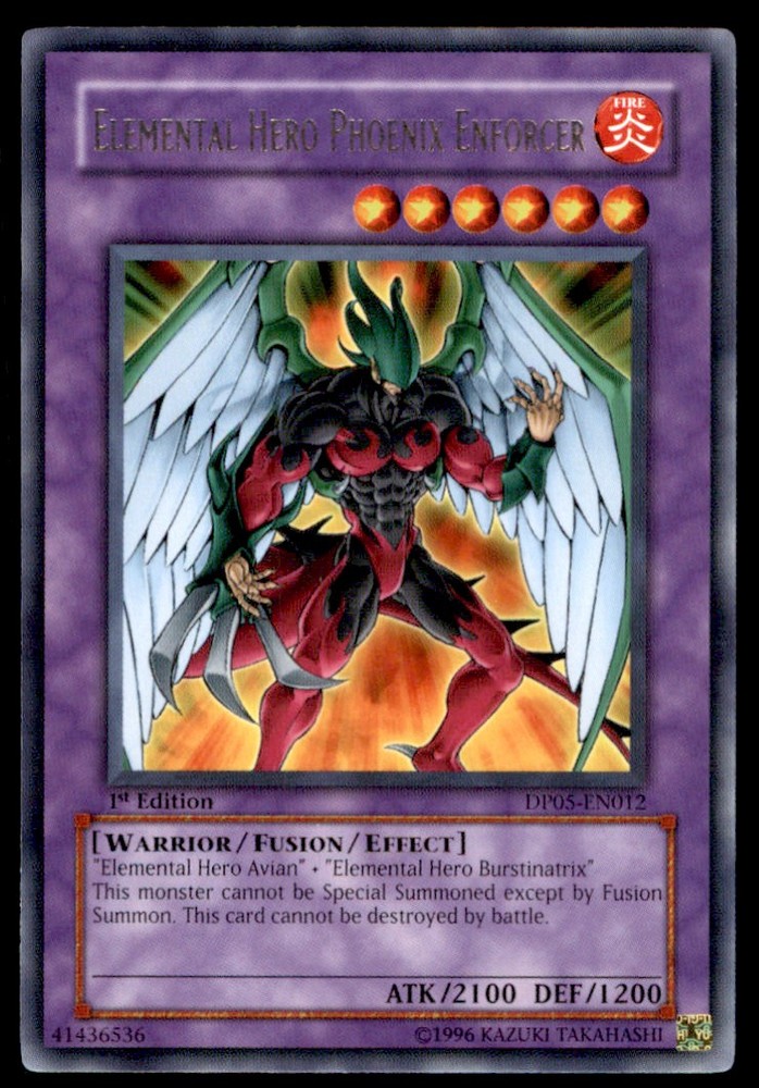 About Me Other Listings Feedback Add to Favorites Contact Me Bluenose Yu-Gi-Oh! Elemental Hero Phoenix Enforcer #DP05-EN012 1st Edition Near Mint No stock photo / These are real scans or pictures Details Description: Elemental Hero Phoenix Enforcer Category: Yugioh Year: 1996 Product: Yu-Gi-Oh! Card Number: DP05-EN012 Special: 1st Edition Near Mint Dimensions: 3¼" x 2¼" SKU: YU B0004 R03 A (17) Payment Payment for buy it now is required immediately and for auctions it must be paid within 72 hours. Shipping Shipments usually make their way out in 1-2 business days. Returns and Claims Please view listing photo and description prior to purchase of card to make sure the card and condition is right for you! About Us Please keep in mind the following conditions .-------------------------------------------Near Mint: a card that shows very little to no signs of ware or usage such as very little whiting. -------------------------------------------Light Play: A card that shows signs of ware such as but not limited to whiting, slight bend or scratches. -------------------------------------------Heavy Play: A card that shows signs of ware, whiting, bending, creasing, folding or other various issues.-------------------------------------------Damaged: a card in very bad condition can have some or all of the above mentioned condition notes including peeling, stains, writing, etc.-------------------------------------------The photo in ads are the EXACT card you will recieve. Listing By Kronocard trading cards software v2.8.2.3