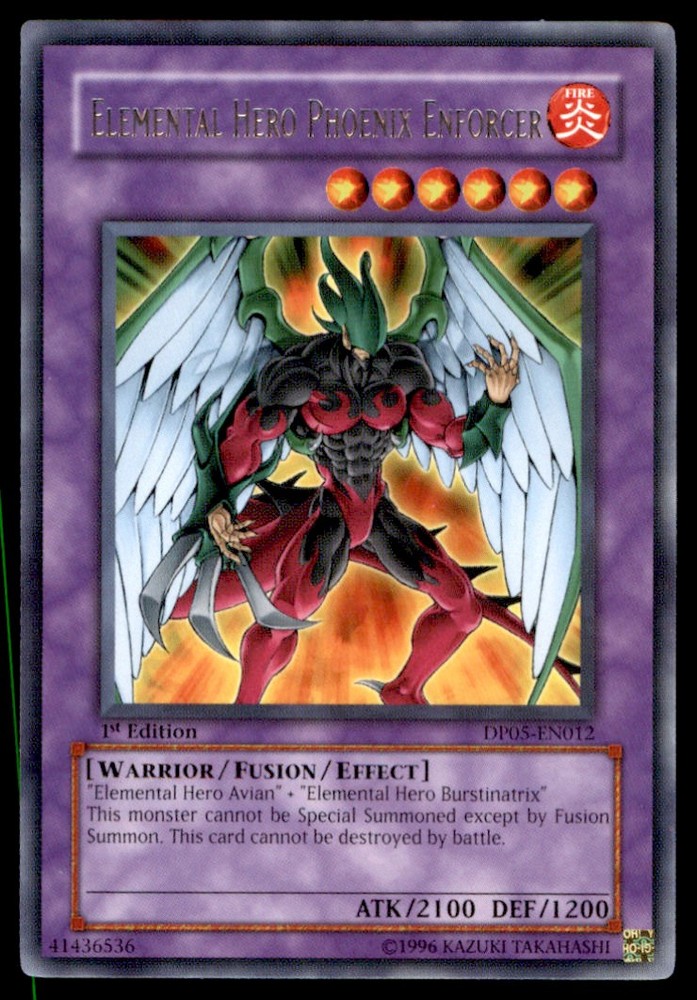 About Me Other Listings Feedback Add to Favorites Contact Me Bluenose Yu-Gi-Oh! Elemental Hero Phoenix Enforcer #DP05-EN012 1st Edition Near Mint No stock photo / These are real scans or pictures Details Description: Elemental Hero Phoenix Enforcer Category: Yugioh Year: 1996 Product: Yu-Gi-Oh! Card Number: DP05-EN012 Special: 1st Edition Near Mint Dimensions: 3¼" x 2¼" SKU: YU B0004 R03 O (19) Payment Payment for buy it now is required immediately and for auctions it must be paid within 72 hours. Shipping Shipments usually make their way out in 1-2 business days. Returns and Claims Please view listing photo and description prior to purchase of card to make sure the card and condition is right for you! About Us Please keep in mind the following conditions .-------------------------------------------Near Mint: a card that shows very little to no signs of ware or usage such as very little whiting. -------------------------------------------Light Play: A card that shows signs of ware such as but not limited to whiting, slight bend or scratches. -------------------------------------------Heavy Play: A card that shows signs of ware, whiting, bending, creasing, folding or other various issues.-------------------------------------------Damaged: a card in very bad condition can have some or all of the above mentioned condition notes including peeling, stains, writing, etc.-------------------------------------------The photo in ads are the EXACT card you will recieve. Listing By Kronocard trading cards software v2.8.2.3