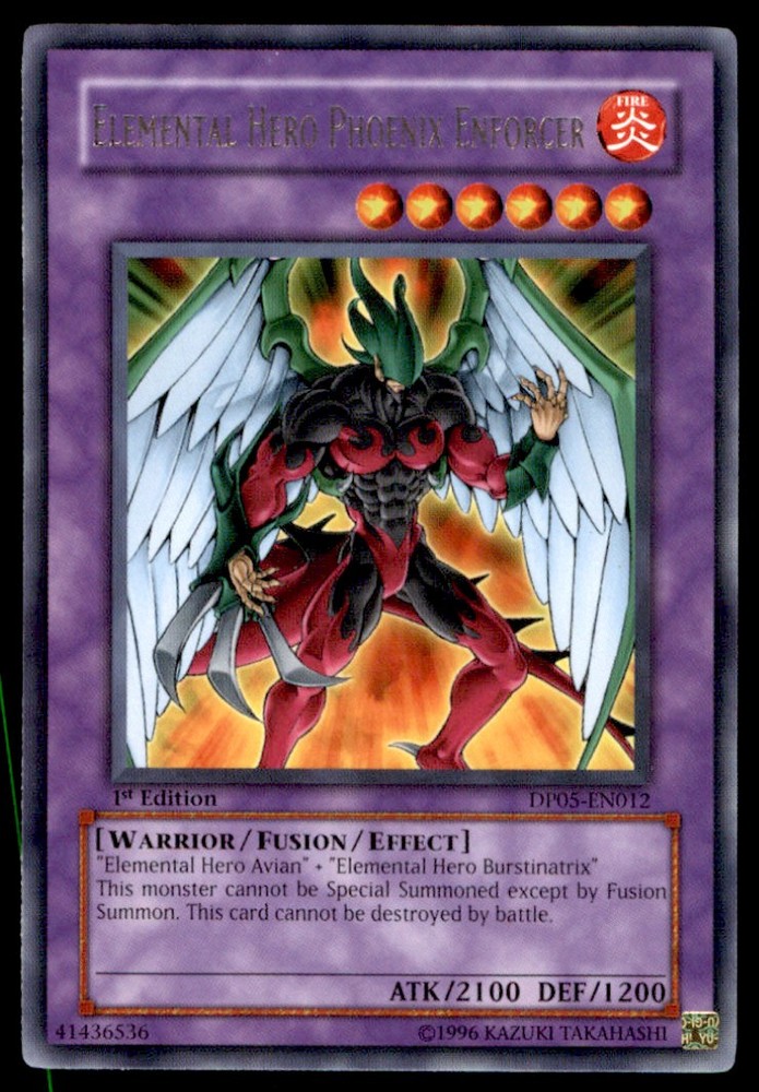 About Me Other Listings Feedback Add to Favorites Contact Me Bluenose Yu-Gi-Oh! Elemental Hero Phoenix Enforcer #DP05-EN012 1st Edition Near Mint No stock photo / These are real scans or pictures Details Description: Elemental Hero Phoenix Enforcer Category: Yugioh Year: 1996 Product: Yu-Gi-Oh! Card Number: DP05-EN012 Special: 1st Edition Near Mint Dimensions: 3¼" x 2¼" SKU: YU B0004 R03 P (18) Payment Payment for buy it now is required immediately and for auctions it must be paid within 72 hours. Shipping Shipments usually make their way out in 1-2 business days. Returns and Claims Please view listing photo and description prior to purchase of card to make sure the card and condition is right for you! About Us Please keep in mind the following conditions .-------------------------------------------Near Mint: a card that shows very little to no signs of ware or usage such as very little whiting. -------------------------------------------Light Play: A card that shows signs of ware such as but not limited to whiting, slight bend or scratches. -------------------------------------------Heavy Play: A card that shows signs of ware, whiting, bending, creasing, folding or other various issues.-------------------------------------------Damaged: a card in very bad condition can have some or all of the above mentioned condition notes including peeling, stains, writing, etc.-------------------------------------------The photo in ads are the EXACT card you will recieve. Listing By Kronocard trading cards software v2.8.2.3