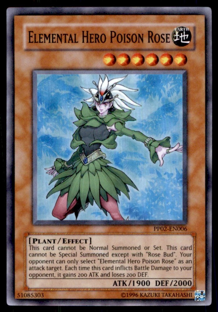 About Me Other Listings Feedback Add to Favorites Contact Me Bluenose Yu-Gi-Oh! Elemental Hero Poison Rose #PP02-EN006 Light Play No stock photo / These are real scans or pictures Details Description: Elemental Hero Poison Rose Category: Yugioh Year: 1996 Product: Yu-Gi-Oh! Card Number: PP02-EN006 Special: Light Play Dimensions: 3¼" x 2¼" SKU: YU B0003 R03 N (23) Payment Payment for buy it now is required immediately and for auctions it must be paid within 72 hours. Shipping Shipments usually make their way out in 3 business days. All orders to USA under 800$ USD typically are NOT subject to import or duty! We also offer free shipping on all our cards for north america. Returns and Claims Please view listing photo and description prior to purchase of card to make sure the card and condition is right for you! About Us Please keep in mind the following conditions .-------------------------------------------Near Mint: a card that shows very little to no signs of ware or usage such as very little whiting. -------------------------------------------Light Play: A card that shows signs of ware such as but not limited to whiting, slight bend or scratches. -------------------------------------------Heavy Play: A card that shows signs of ware, whiting, bending, creasing, folding or other various issues.-------------------------------------------Damaged: a card in very bad condition can have some or all of the above mentioned condition notes including peeling, stains, writing, etc.-------------------------------------------The photo in ads are the EXACT card you will recieve. Listing By Kronocard trading cards software v2.7.0.1