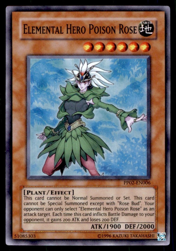 About Me Other Listings Feedback Add to Favorites Contact Me Bluenose Yu-Gi-Oh! Elemental Hero Poison Rose #PP02-EN006 Light Play No stock photo / These are real scans or pictures Details Description: Elemental Hero Poison Rose Category: Yugioh Year: 1996 Product: Yu-Gi-Oh! Card Number: PP02-EN006 Special: Light Play Dimensions: 3½" x 2¼" SKU: YU B0003 R04 U (16) Payment Payment for buy it now is required immediately and for auctions it must be paid within 72 hours. Shipping Shipments usually make their way out in 3 business days. All orders to USA under 800$ USD typically are NOT subject to import or duty! We also offer free shipping on all our cards for north america. Returns and Claims Please view listing photo and description prior to purchase of card to make sure the card and condition is right for you! About Us Please keep in mind the following conditions .-------------------------------------------Near Mint: a card that shows very little to no signs of ware or usage such as very little whiting. -------------------------------------------Light Play: A card that shows signs of ware such as but not limited to whiting, slight bend or scratches. -------------------------------------------Heavy Play: A card that shows signs of ware, whiting, bending, creasing, folding or other various issues.-------------------------------------------Damaged: a card in very bad condition can have some or all of the above mentioned condition notes including peeling, stains, writing, etc.-------------------------------------------The photo in ads are the EXACT card you will recieve. Listing By Kronocard trading cards software v2.7.0.1