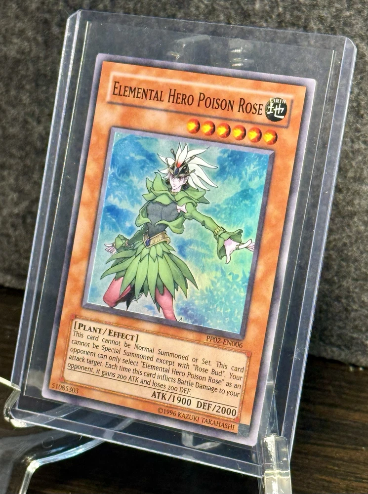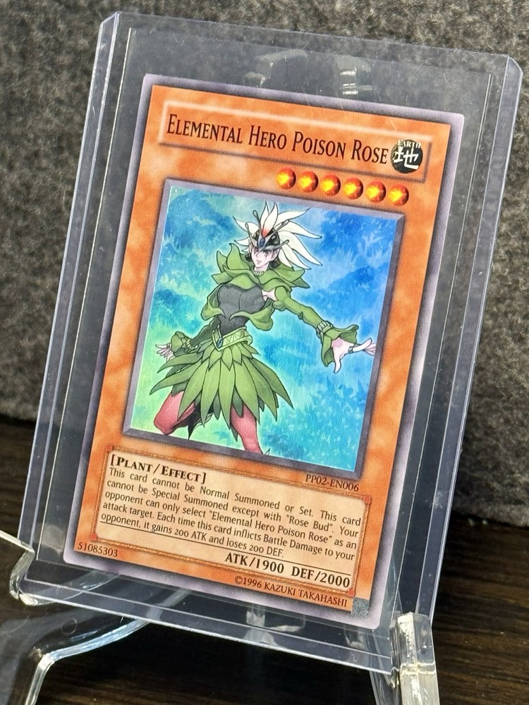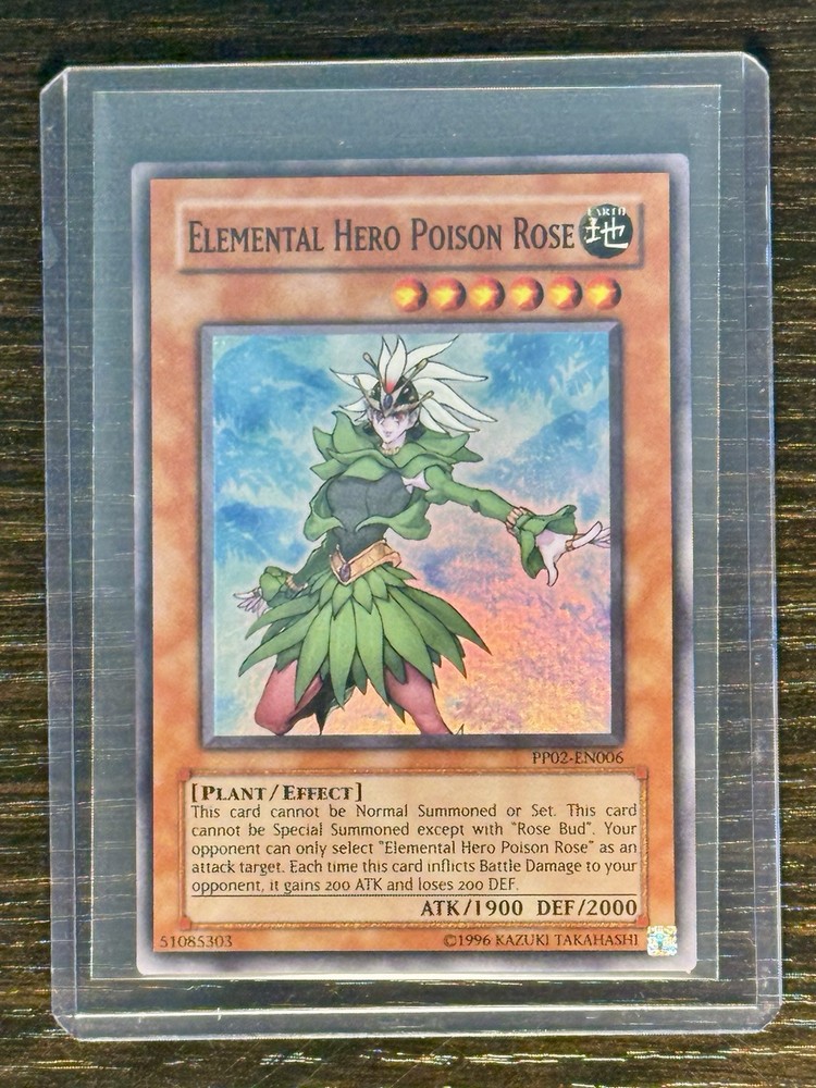 You are buying 1x Yu-Gi-Oh! SUPER RARE Elemental Hero Poison Rose (PP02-EN006) from the "Premium Pack 2" set, r eleased in 2008 . Card Text : This card cannot be Normal Summoned or Set. This card cannot be Special Summoned except with "Rose Bud". Your opponent can only select "Elemental Hero Poison Rose" as an attack target. Each time this card inflicts Battle Damage to your opponent, it gains 200 ATK and loses 200 DEF . Shipping : Within 24 hours of payment. Shipped in hard plastic sleeve & bubble wrap to ensure top protection. Condition : Near-Mint Condition. See all photos in listing for more detail. Additional photos also available upon request.