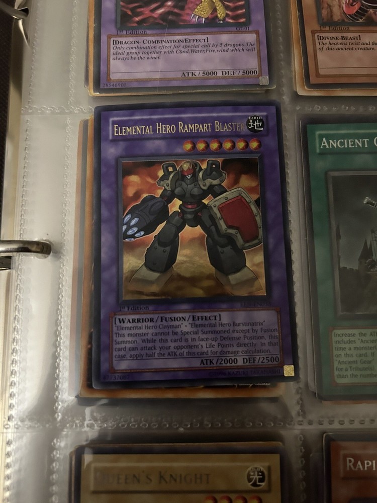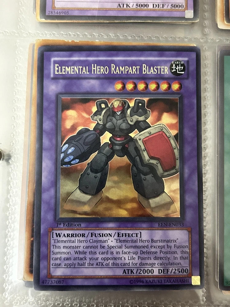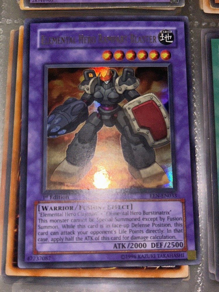 Yu-Gi-Oh! Elemental Hero Rampart Blaster #EN033 1st Edition Ultimate Rare NM/LP. Open to offers! I bought these when I was like 7 and never actually played these sort of games so they just sat in the sleeves for over a decade. These haven’t actually ever been “played,” and the only contact they’ve had has been by moving them once into another container. Of the cards I have graded from this collection, most have been between a PSA 8-10. This one is in pretty good shape, but please look at the pictures for reference. All sales are final. Sold as-is, no guarantees or returns.